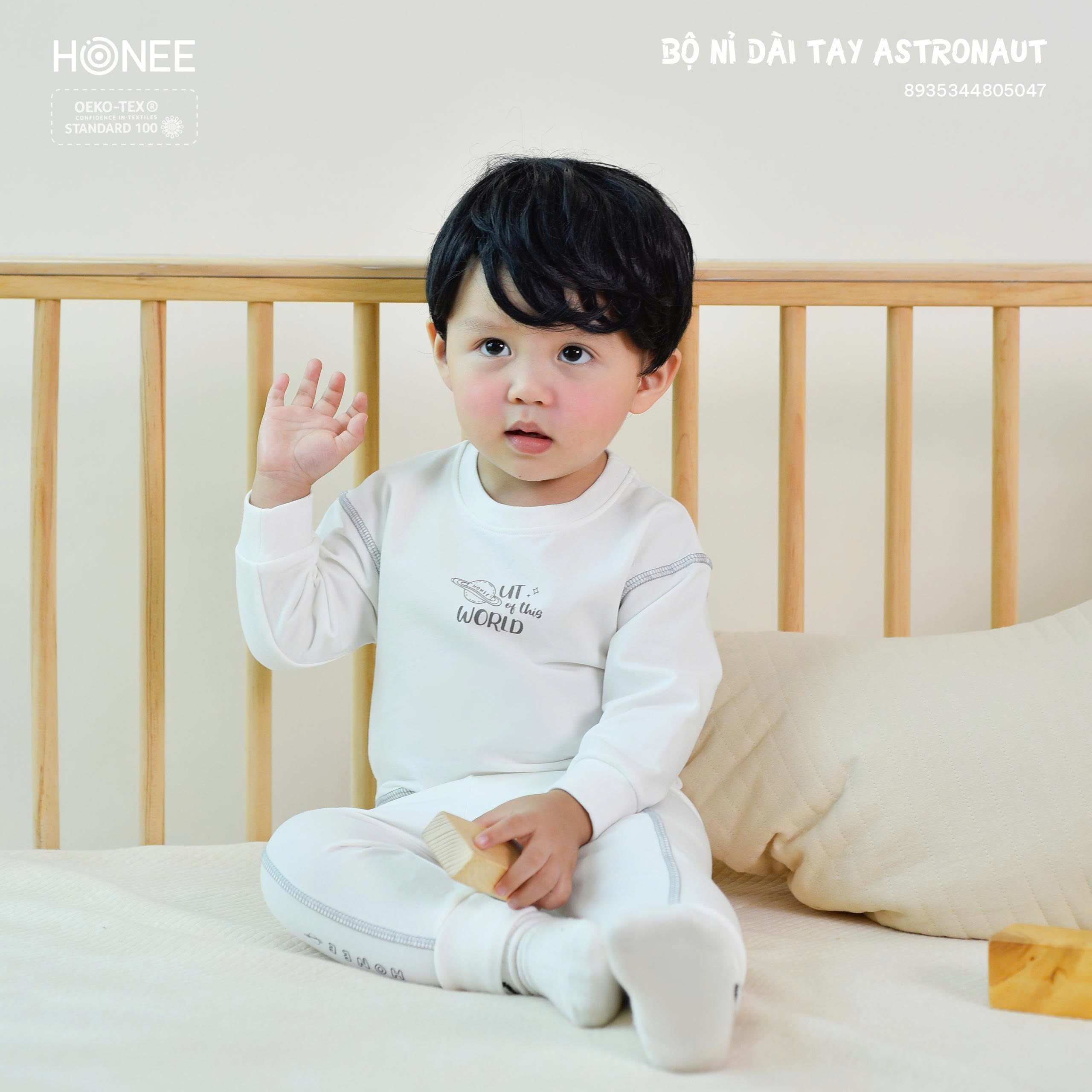 Comfy round-neck top. Separate top and bottom make changing easy. Ribbed cuffs and hems keep warmth in, allowing baby to move freely all day.