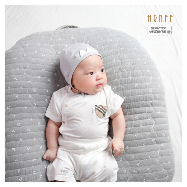The Newborn Cross Button Set offers a delightful blend of style and comfort with its unique cross-button design and a small checkered pocket on the chest.