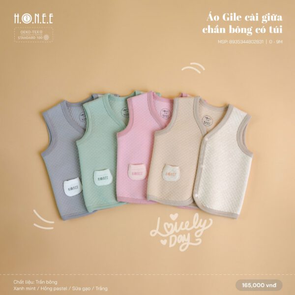 Áo gile cài giữa chần bông HRNEE dành riêng cho trẻ sơ sinh, thiết kế mềm mại, ấm áp với chất liệu chần bông cao cấp. Áo có túi nhỏ là điểm nhấn độc đáo,tiện lợi, kiểu dáng cài giữa giúp dễ dàng thay mặc, phù hợp cho bé trong những ngày se lạnh.