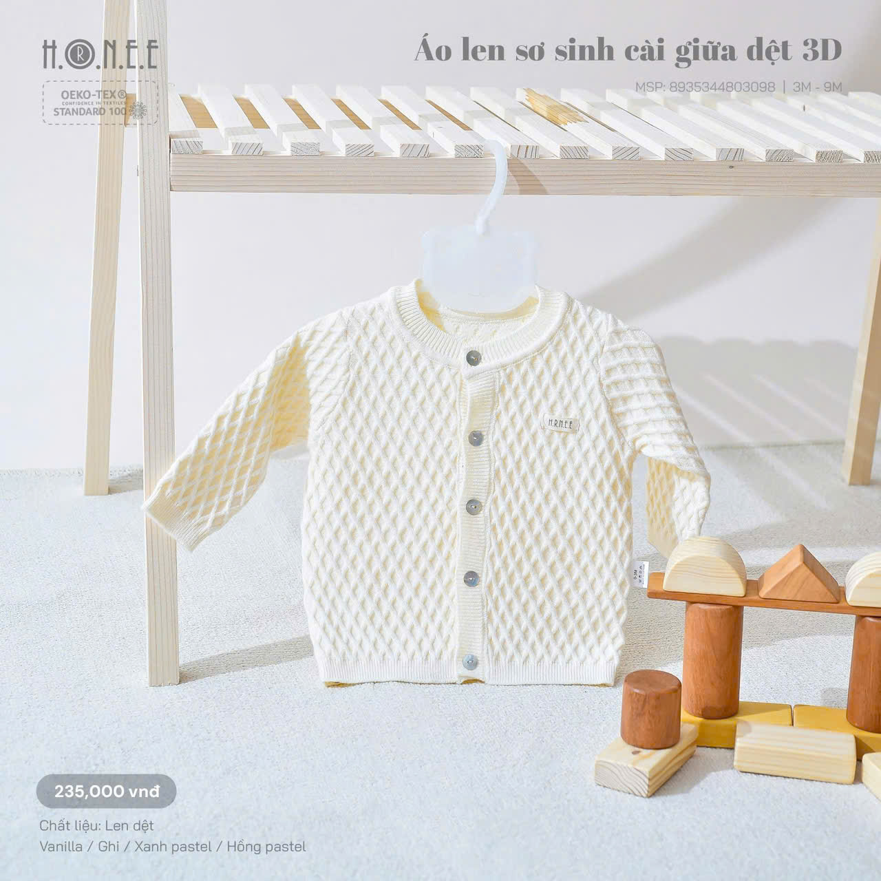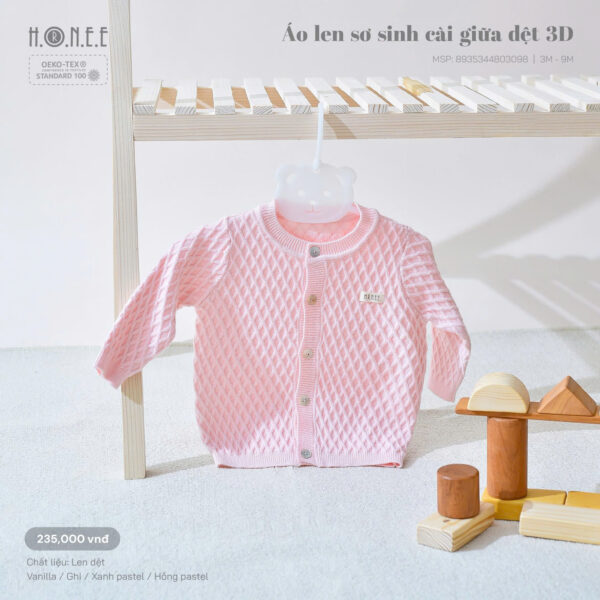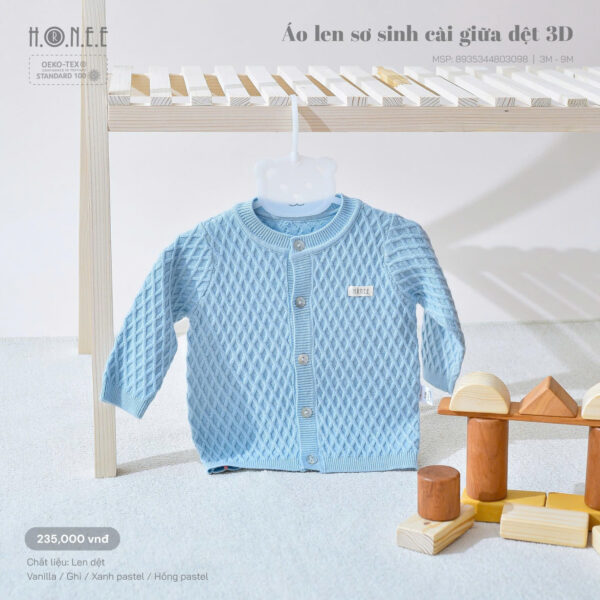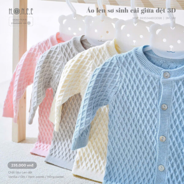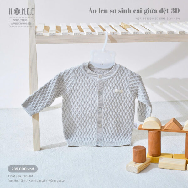 Áo len sơ sinh cài giữa dệt 3D với họa tiết tinh tế, mang lại hiệu ứng đẹp mắt và thời trang cho bé. Chất liệu len dệt cao cấp giúp tăng độ ấm áp, mềm mịn, không gây kích ứng cho làn da nhạy cảm của em bé.