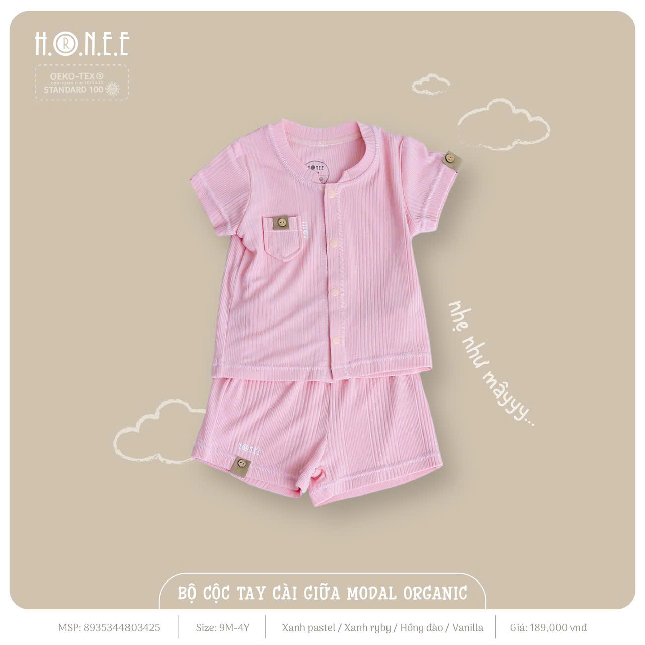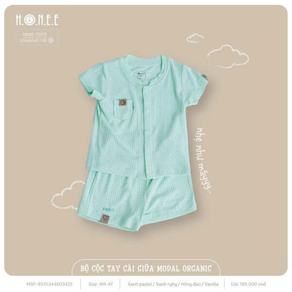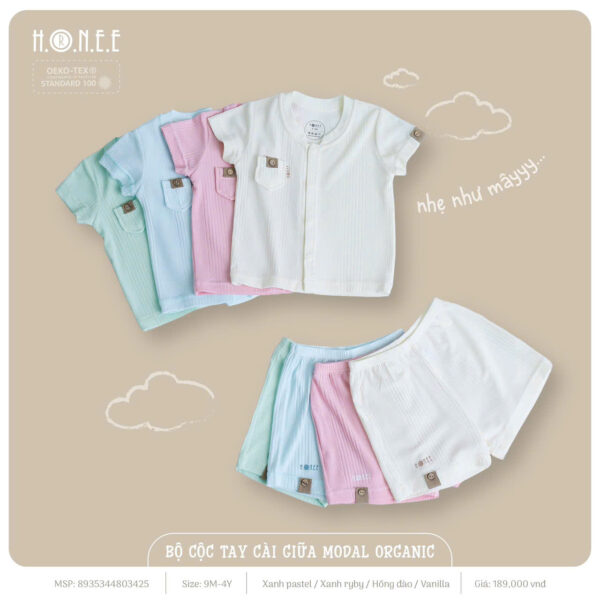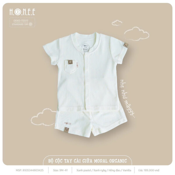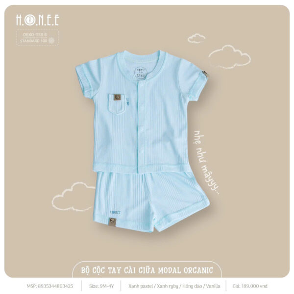 Bộ cộc tay cài giữa Modal Organic cổ V dành cho bé sơ sinh từ 0 đến 9 tháng tuổi được làm từ chất liệu modal organic an toàn và kháng khuẩn, giúp bảo vệ làn da nhạy cảm của bé.