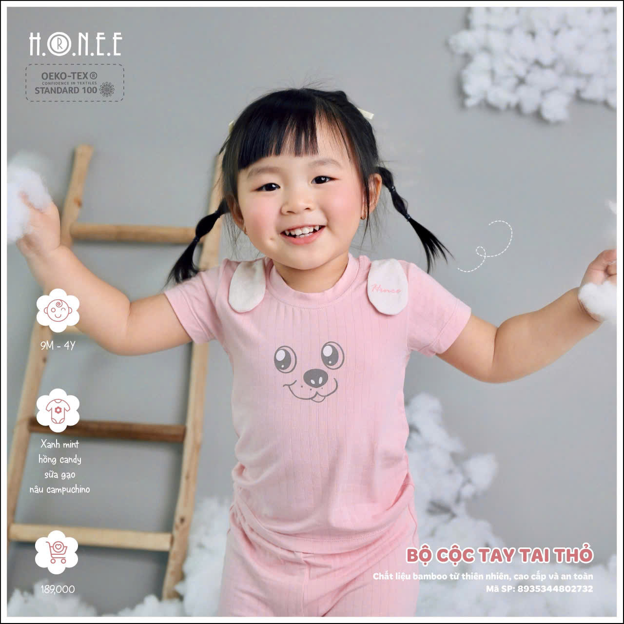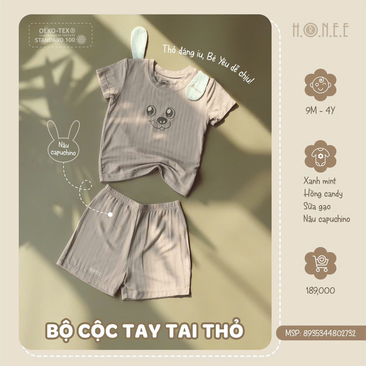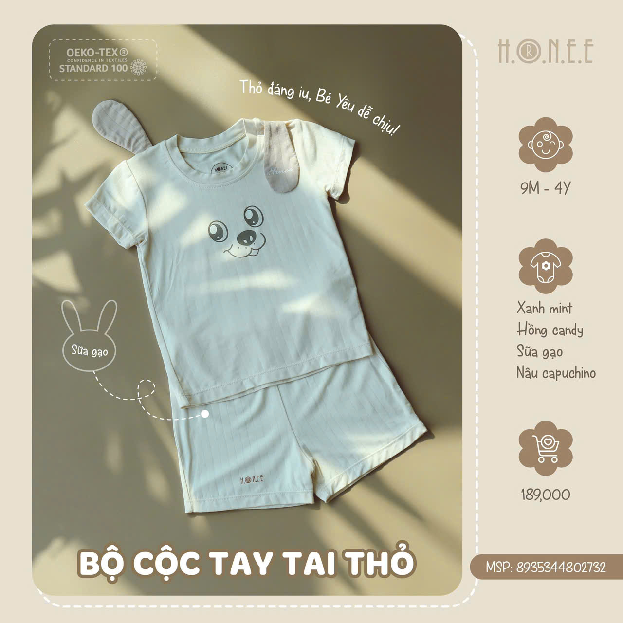 Đặc biệt, bộ đồ đạt chuẩn Oekotex 100 – tiêu chuẩn cao nhất về chất liệu vải sinh học, đảm bảo an toàn tuyệt đối cho sức khỏe của bé. Đây là một cam kết của HRNEE về chất lượng và sự an toàn, với các vật liệu không chứa các chất độc hại, hoàn toàn thân thiện với làn da mỏng manh của bé yêu. Với bộ cộc tay tai thỏ này, các bậc phụ huynh có thể yên tâm về sự an toàn và thoải mái của con, đồng thời mang lại vẻ ngoài cực kỳ đáng yêu và ngộ nghĩnh cho bé yêu của mình.