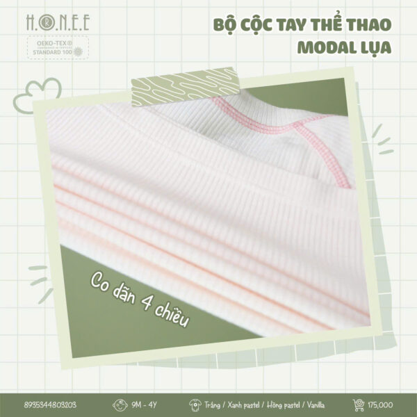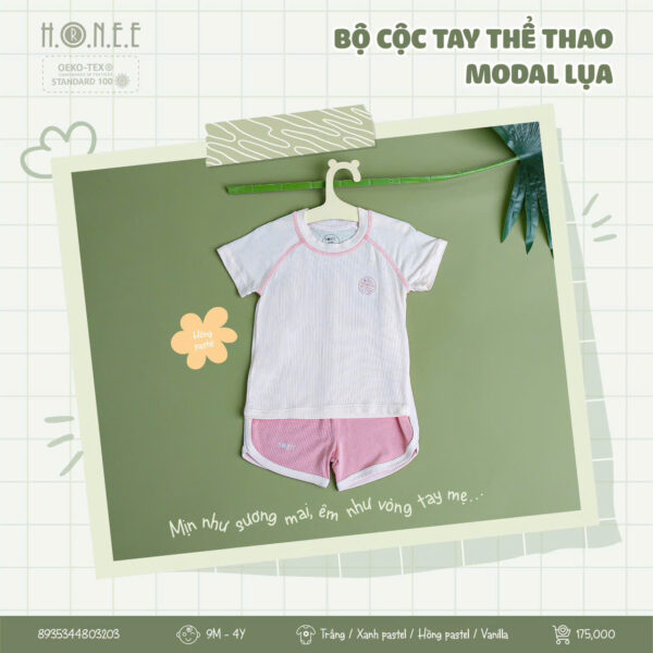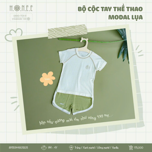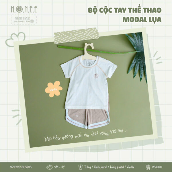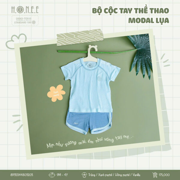Bộ cộc tay thể thao làm từ vải Modal cao cấp mang đến sự thoải mái tối đa cho bé. Chất vải thông hơi, thoáng khí giúp bé luôn khô thoáng suốt cả ngày, trong khi khả năng co giãn linh hoạt tạo sự thoải mái trong mọi hoạt động. Vải Modal mềm mại, mượt mà, giúp bảo vệ làn da nhạy cảm của bé.