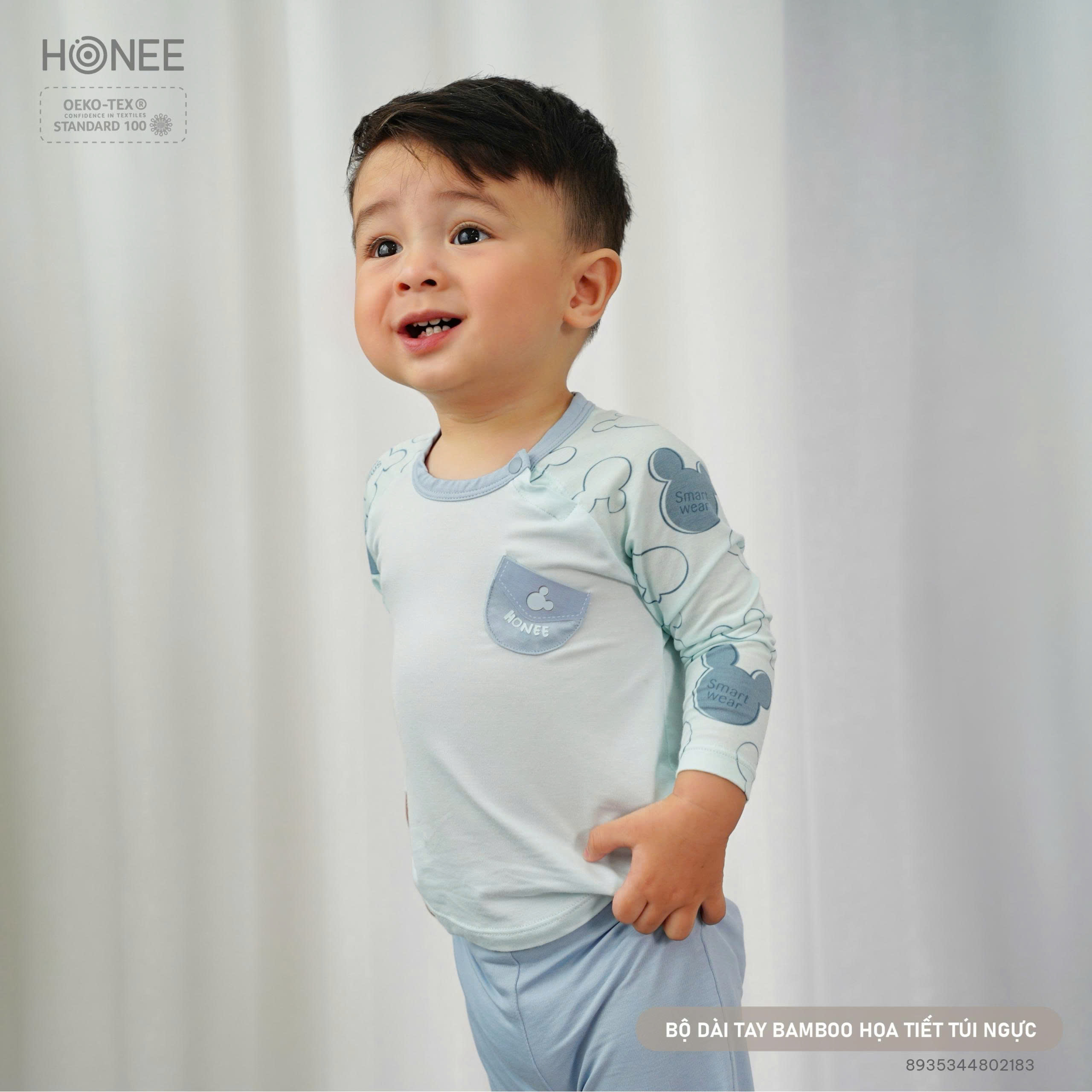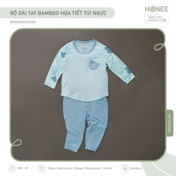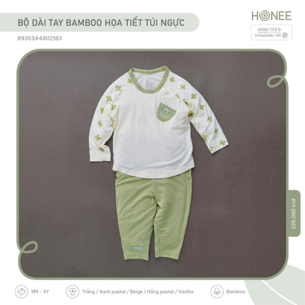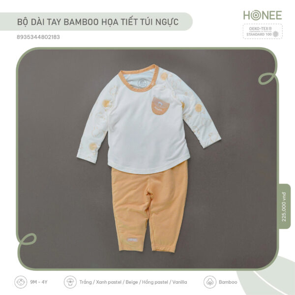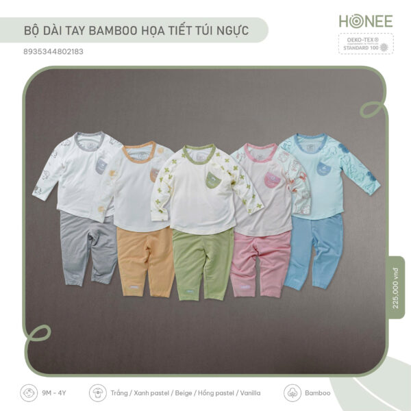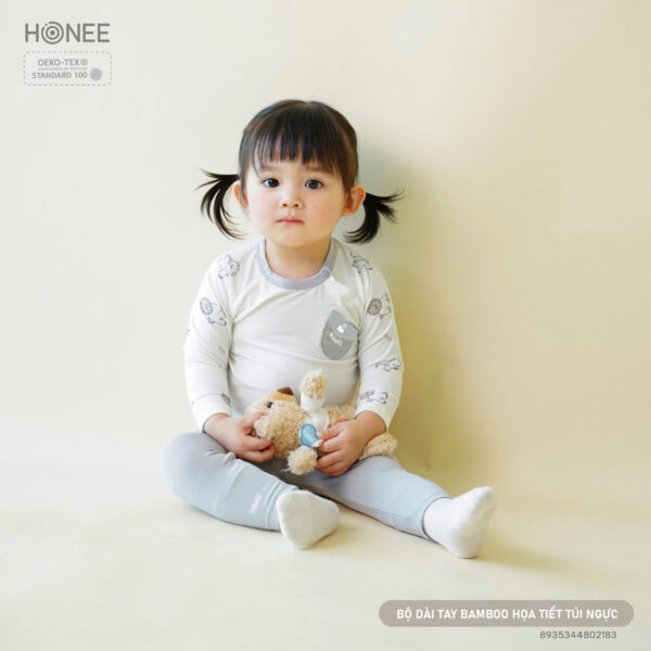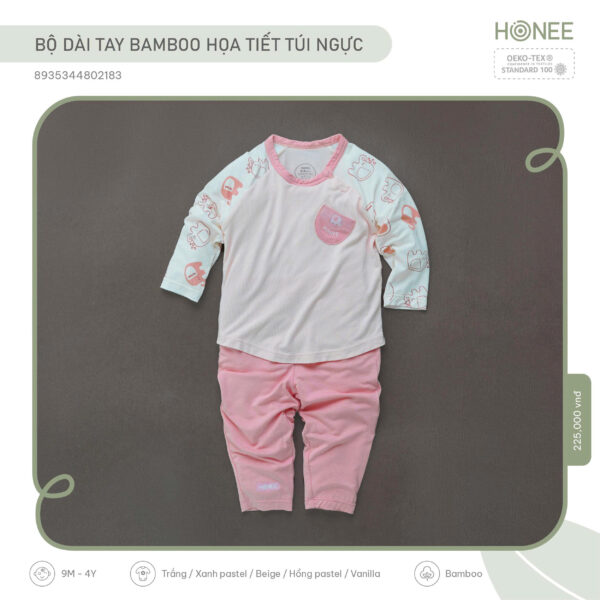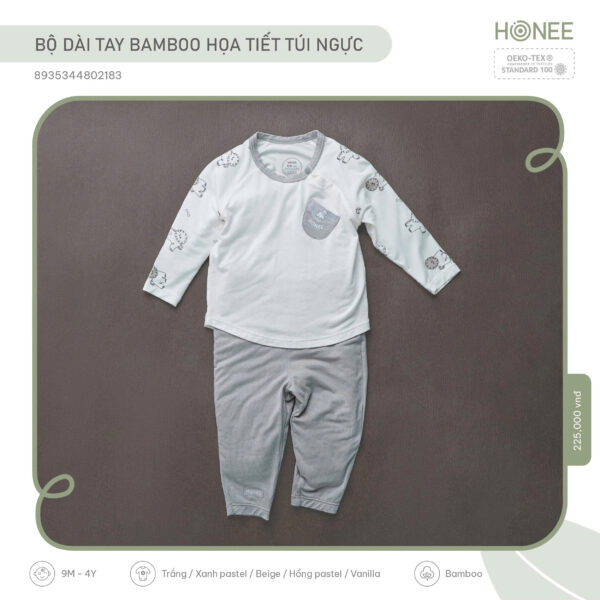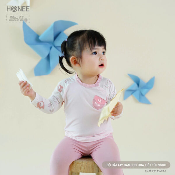 Set đồ gồm áo tay dài cổ tròn, phối viền màu ở tay và túi ngực tạo điểm nhấn. Dáng áo suông vừa vặn, không quá bó, giúp bé vận động thoải mái khi ngồi – bò – đứng dậy – đi chơi.