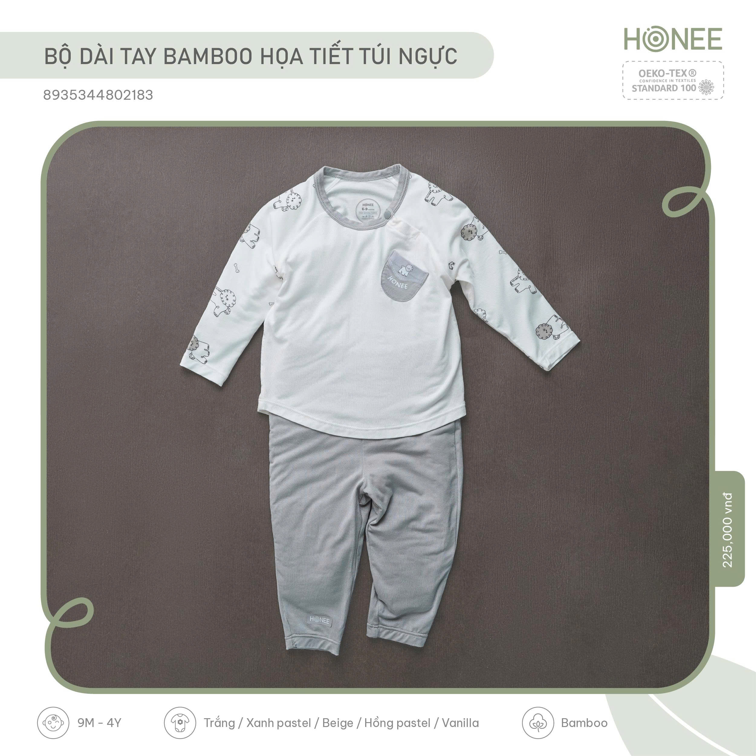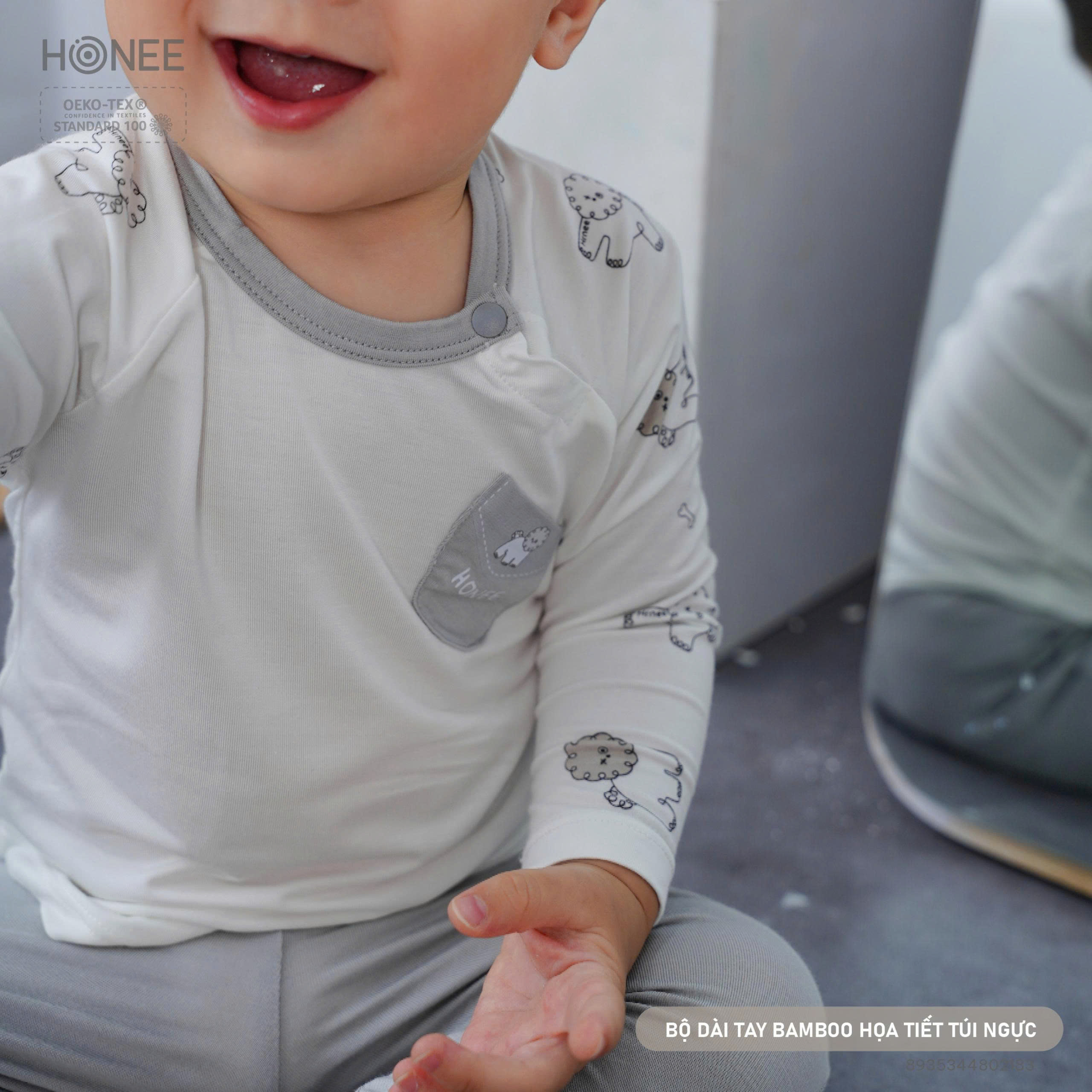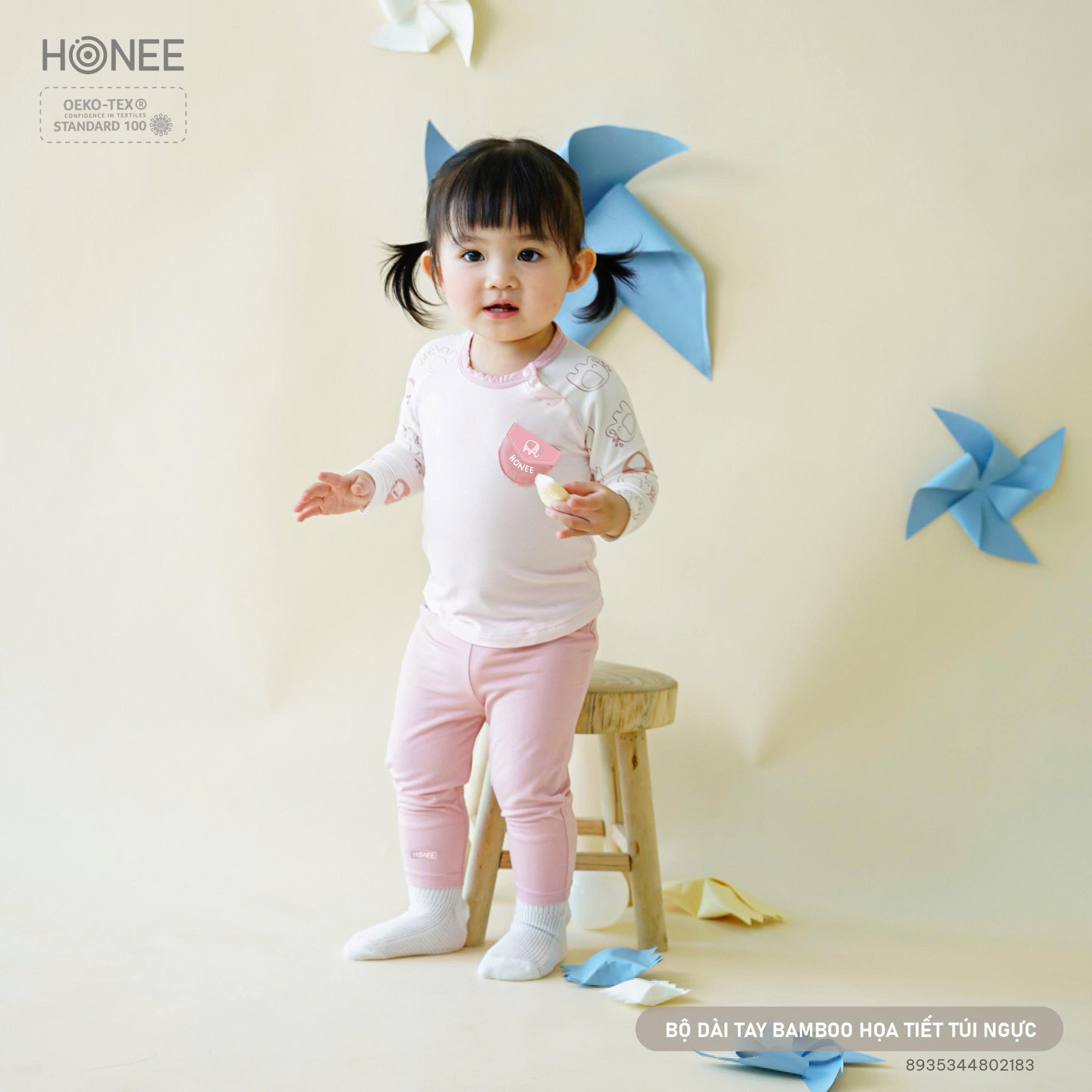 Set đồ gồm áo tay dài cổ tròn, phối viền màu ở tay và túi ngực tạo điểm nhấn. Dáng áo suông vừa vặn, không quá bó, giúp bé vận động thoải mái khi ngồi – bò – đứng dậy – đi chơi.