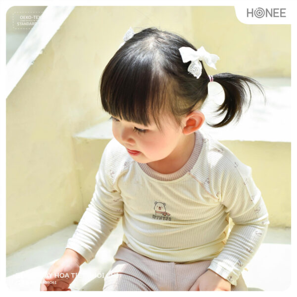 Ứng dụng công nghệ tiêu gân để mặt vải êm mượt, không cọ xát, không hằn đỏ làn da mỏng manh. Họa tiết thêu nhẹ nơi tay áo như một điểm nhấn xinh xắn, tôn lên sự đáng yêu của bé.