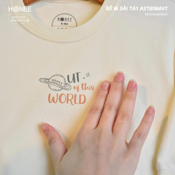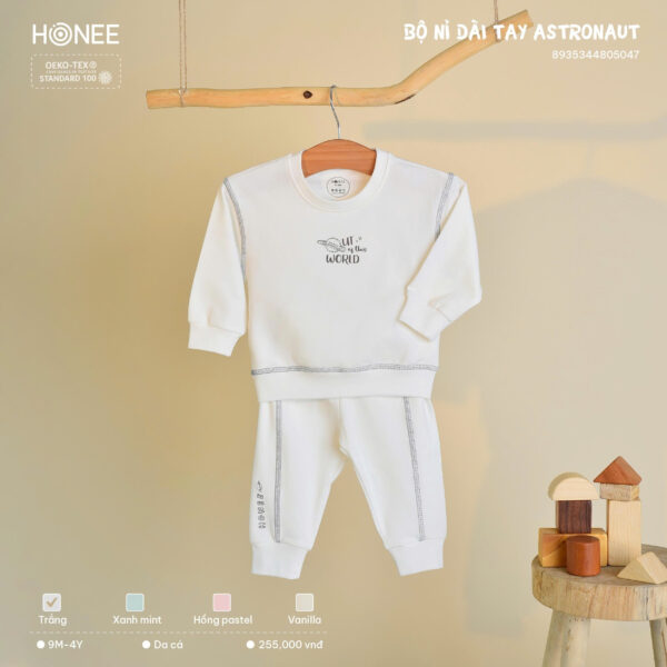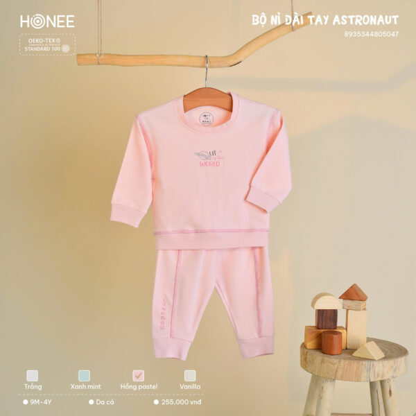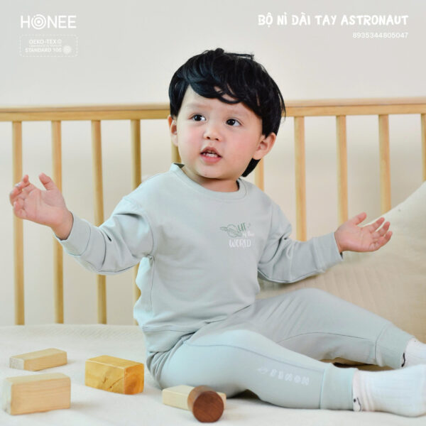 Áo cổ tròn thoải mái, quần và áo tách rời dễ thay. Bo tay – bo chân giữ ấm hiệu quả, bé thoải mái vận động cả ngày dài.