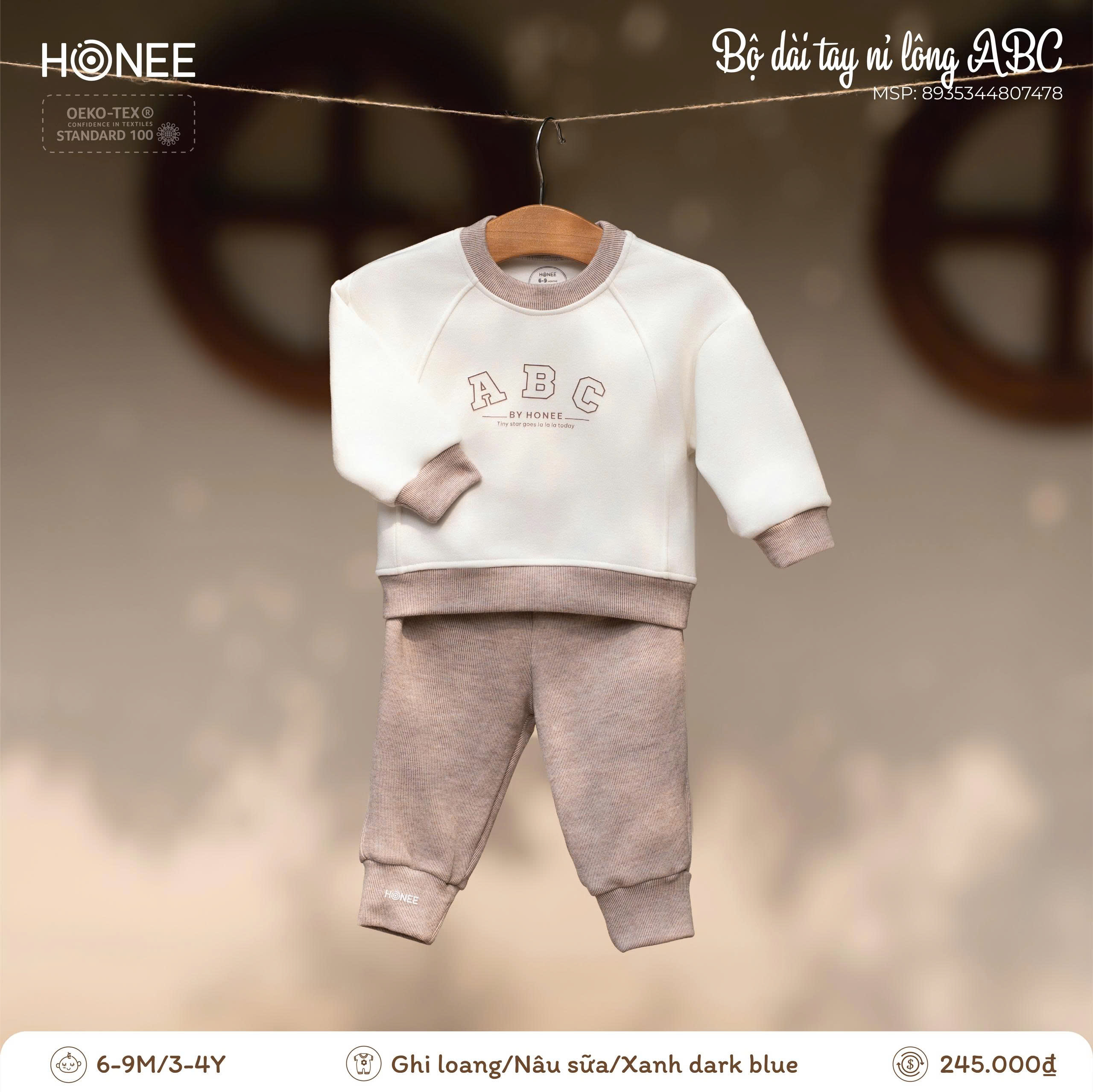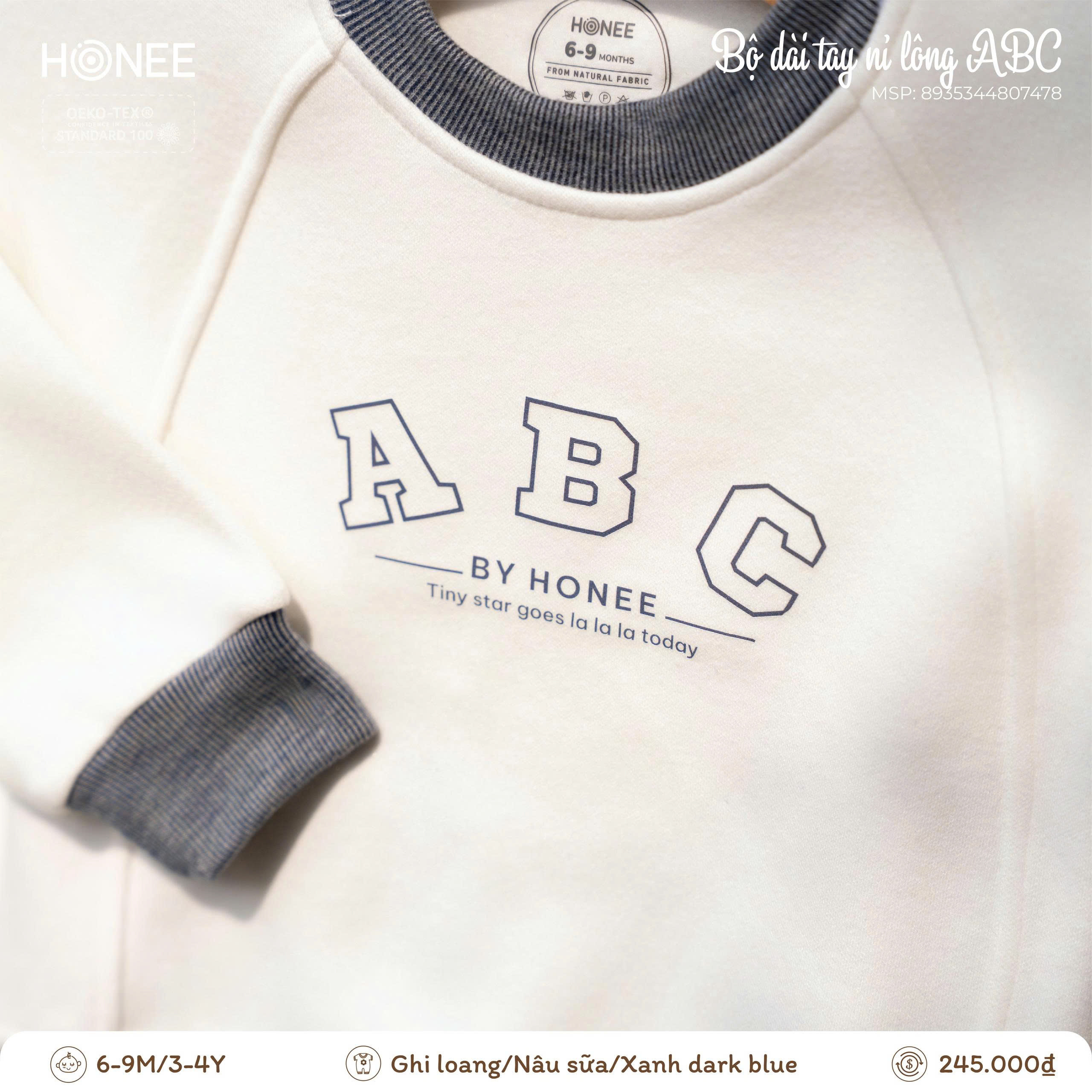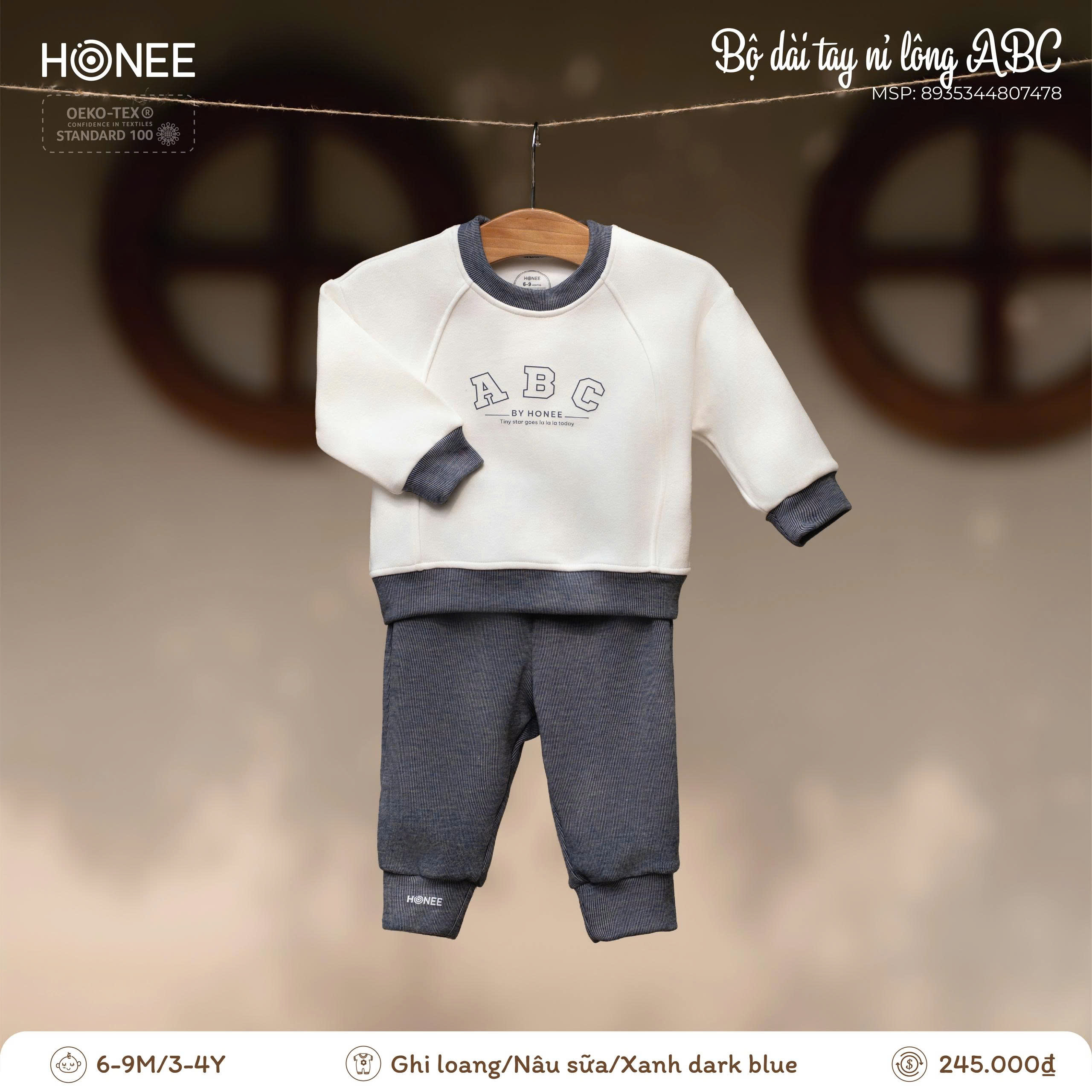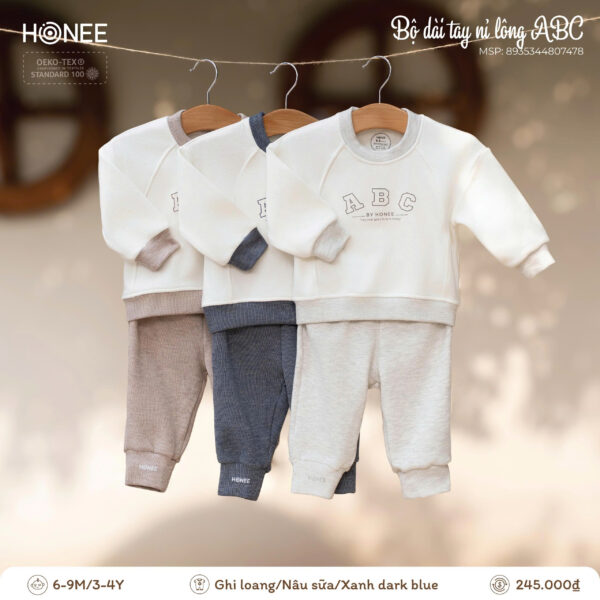 Điểm nhấn chữ ABC BY HONEE tối giản, hiện đại, mang phong cách dễ thương nhưng vẫn thanh lịch. Bảng màu trung tính (ghi loang, nâu sữa, xanh dark blue) dễ phối, phù hợp cho cả bé trai và bé gái, mặc đi học, đi chơi hay ở nhà đều xinh xắn.
