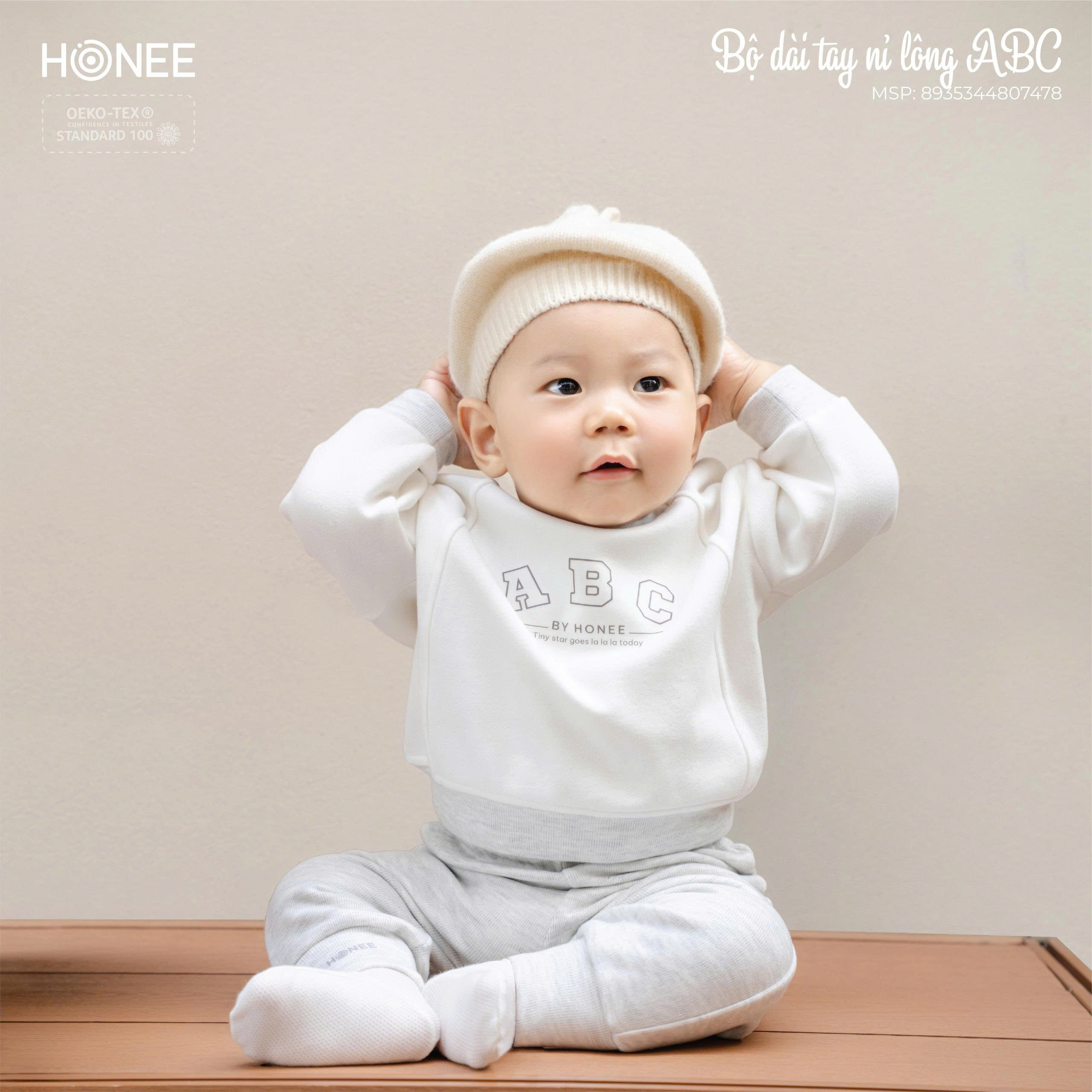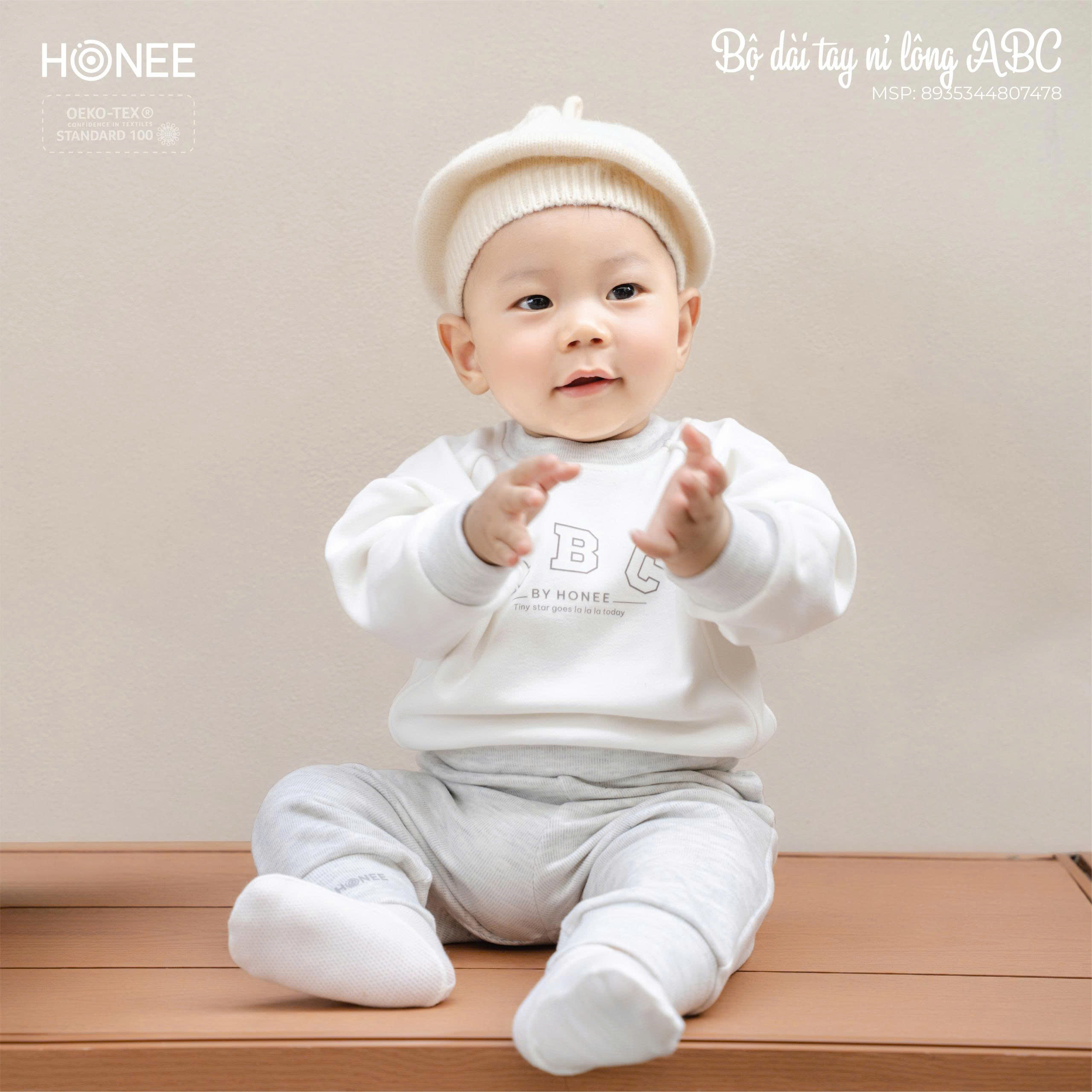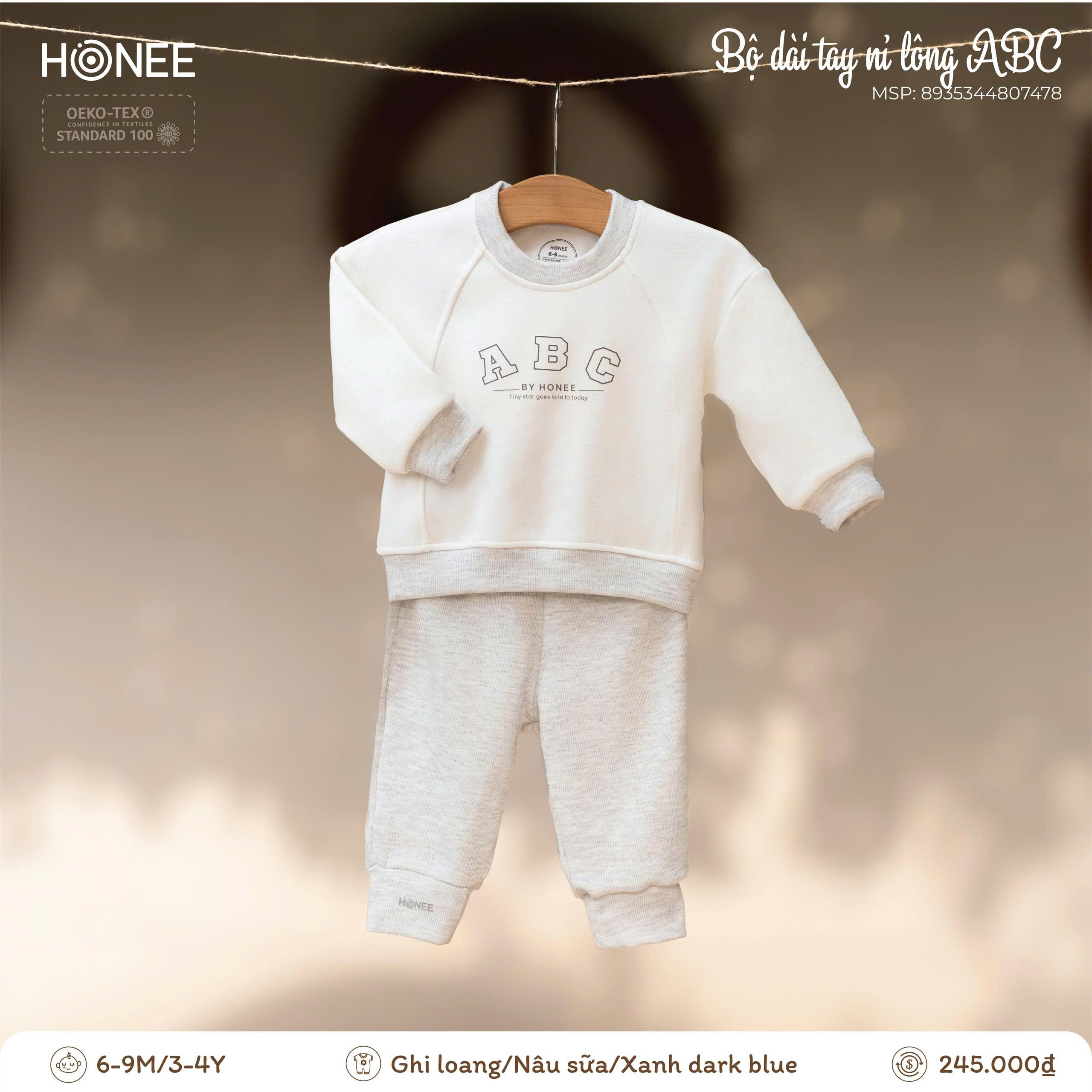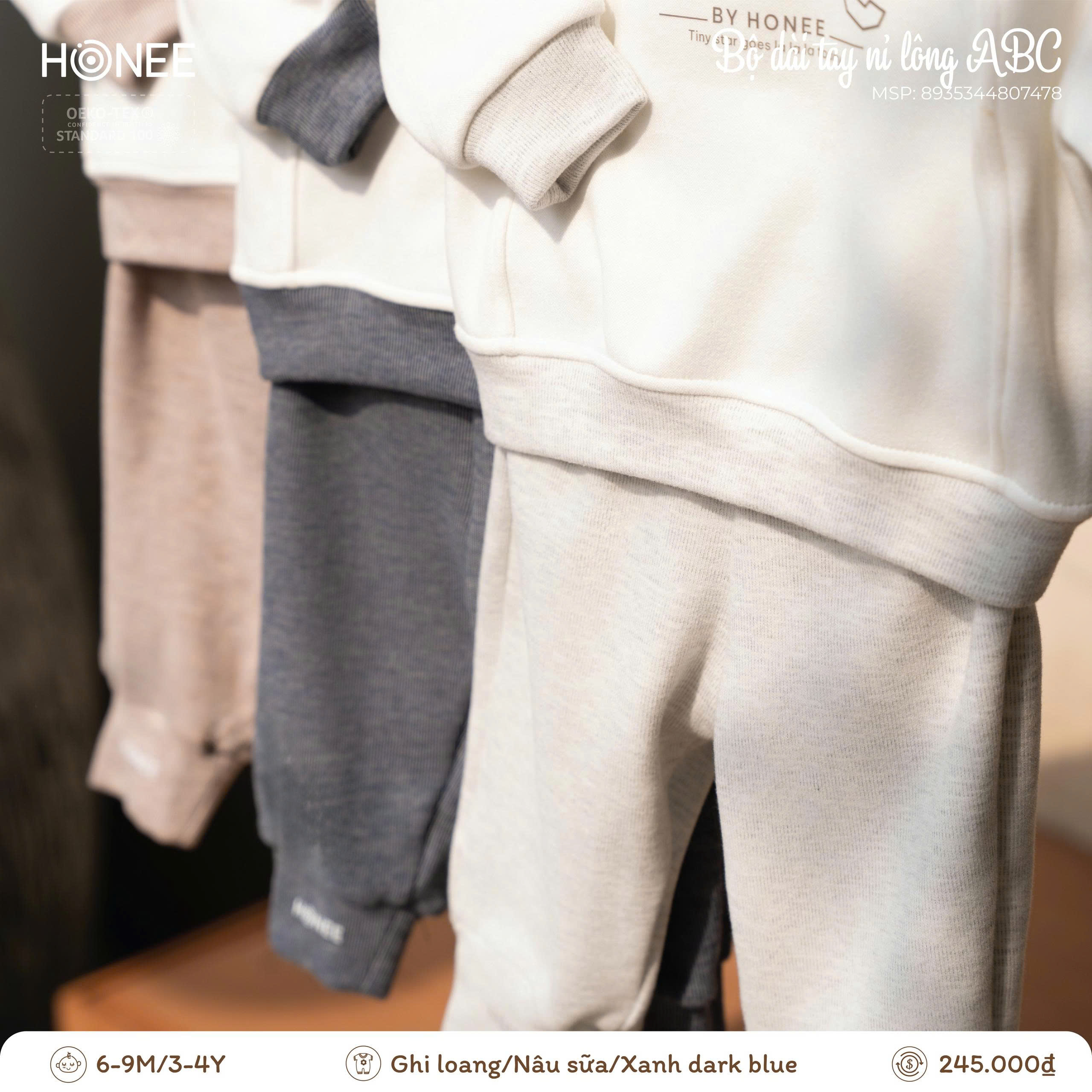 Điểm nhấn chữ ABC BY HONEE tối giản, hiện đại, mang phong cách dễ thương nhưng vẫn thanh lịch. Bảng màu trung tính (ghi loang, nâu sữa, xanh dark blue) dễ phối, phù hợp cho cả bé trai và bé gái, mặc đi học, đi chơi hay ở nhà đều xinh xắn.