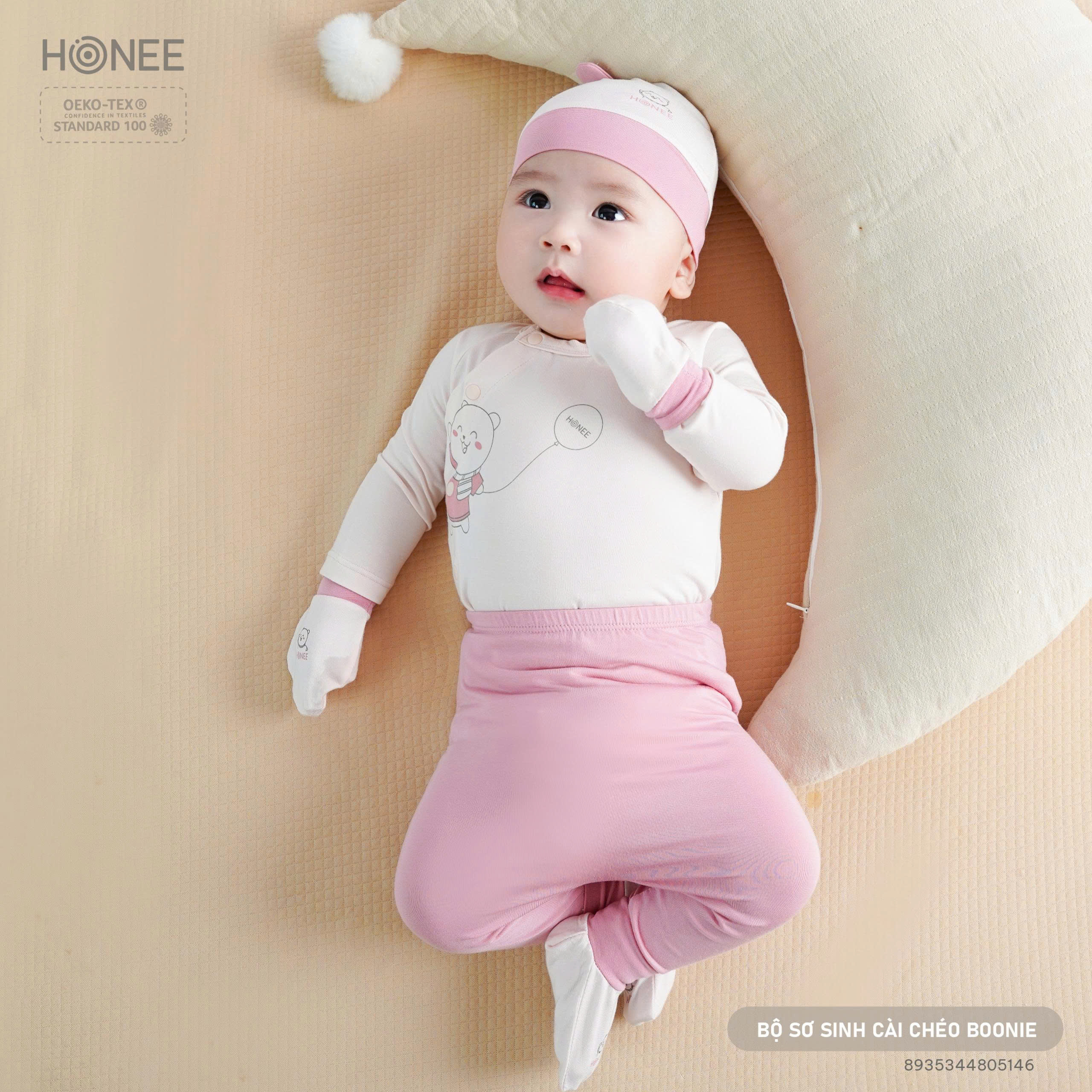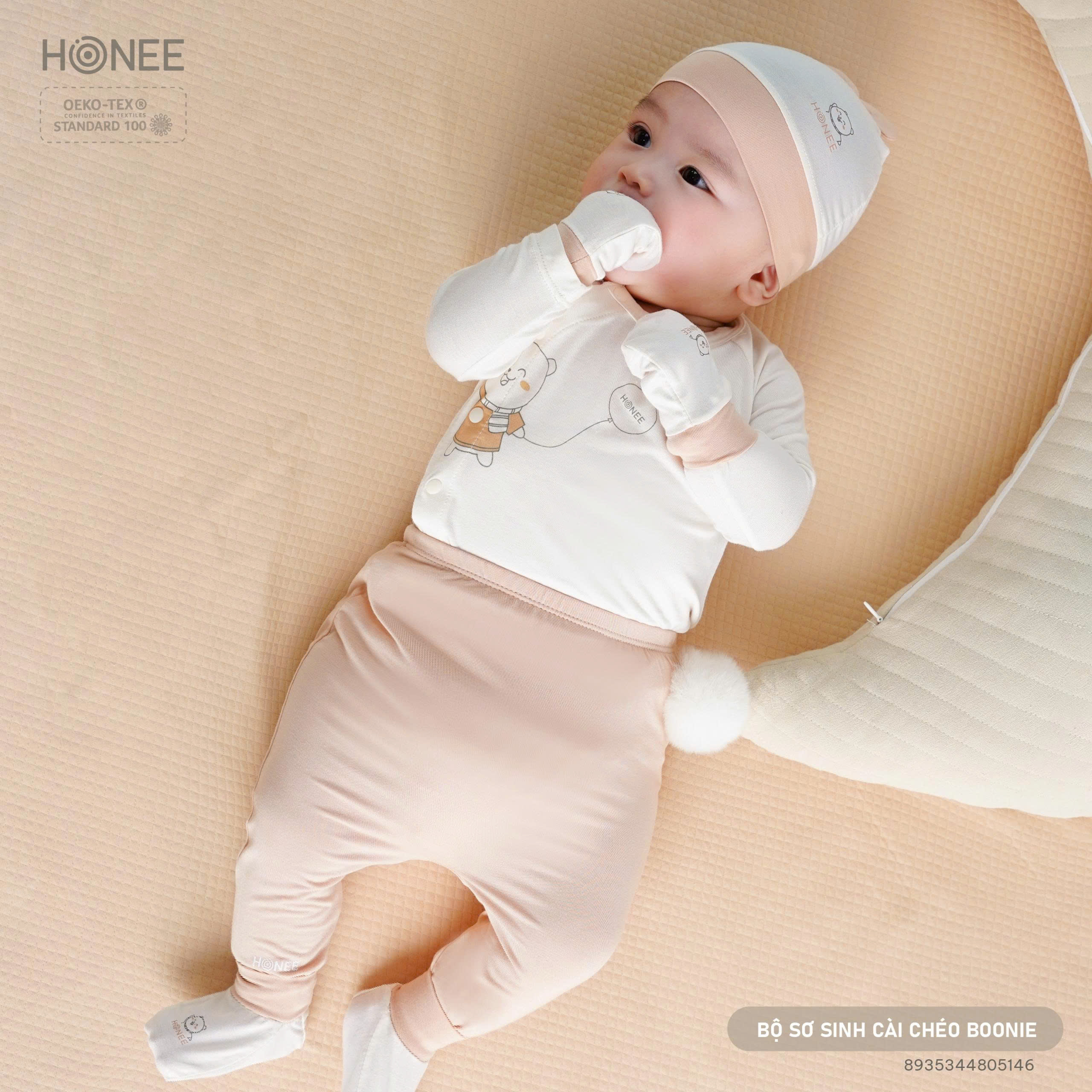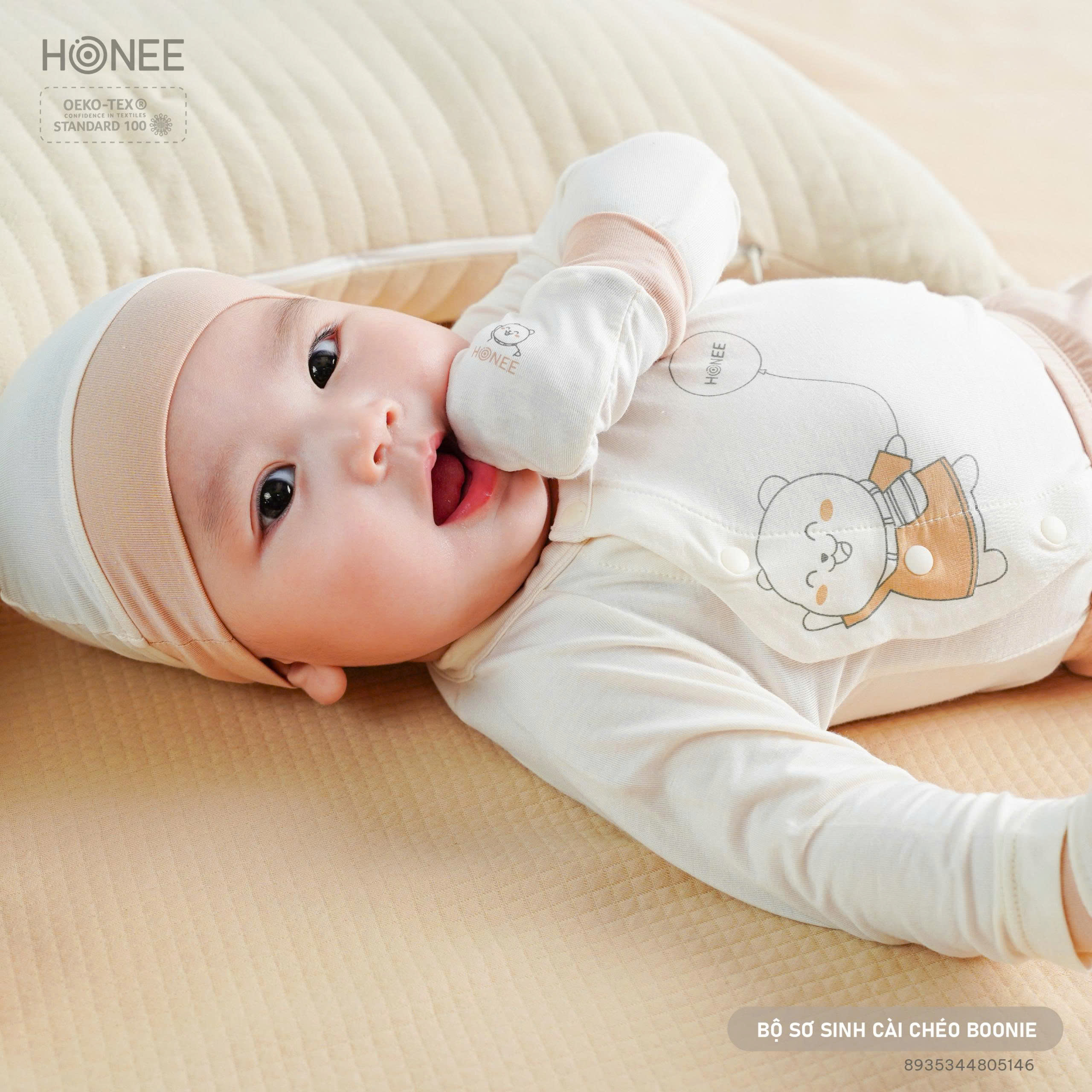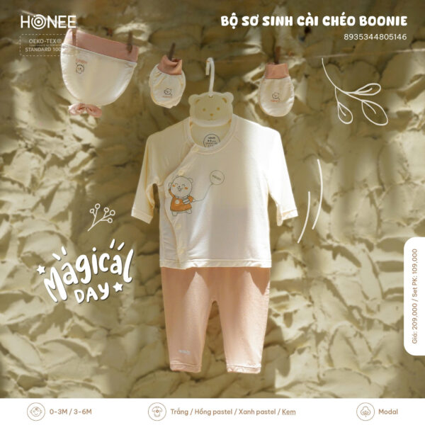 🧸 Họa tiết gấu Boonie in nổi đáng yêu, như một người bạn nhỏ vẫy tay chào con trong ngày đầu đến với thế giới