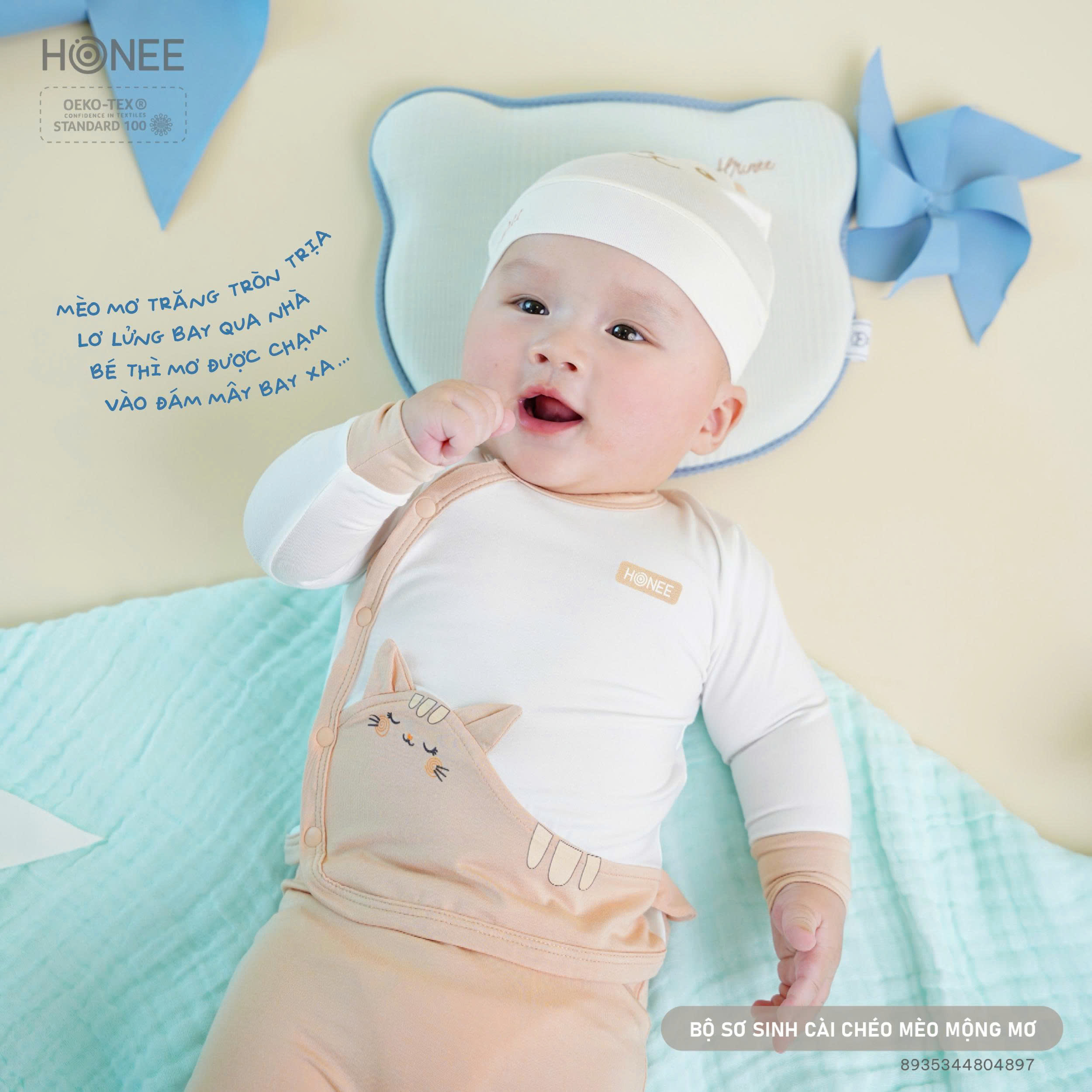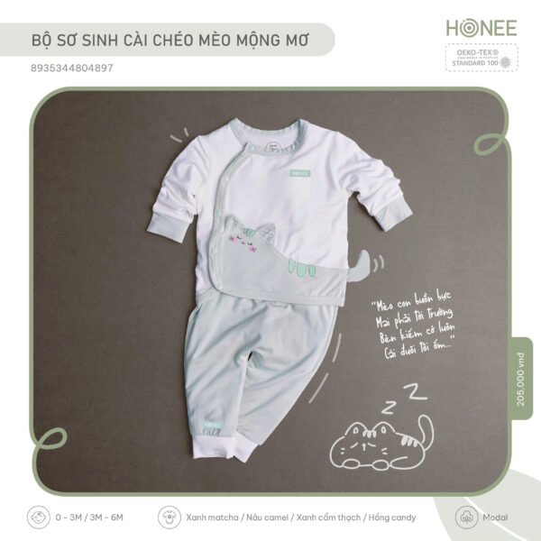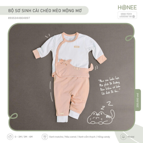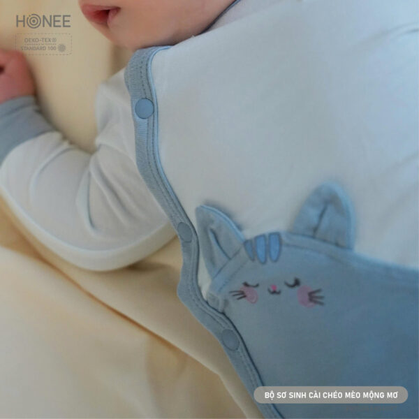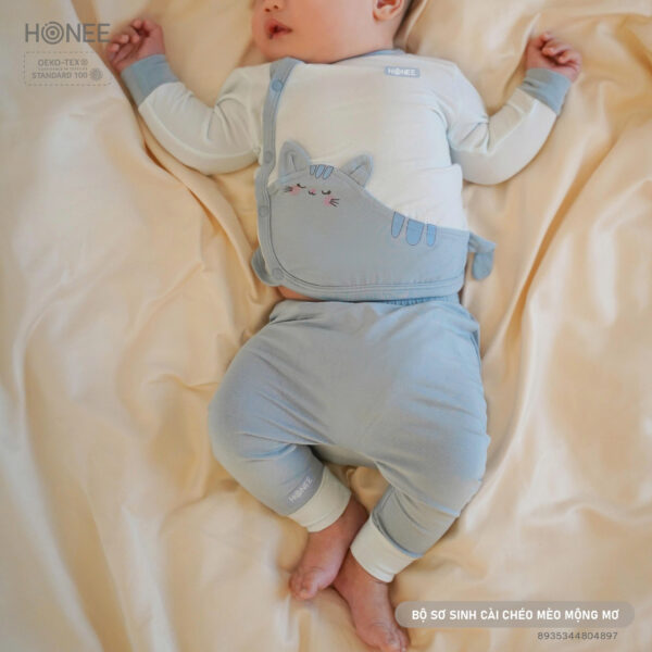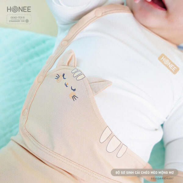 Lấy cảm hứng từ giấc mơ ngọt ngào đầu đời, Honee thiết kế bộ sơ sinh hình mèo với chiếc đuôi cong ôm lấy bụng bé – như một cái ôm nhỏ của mẹ, nhẹ nhàng và an tâm.