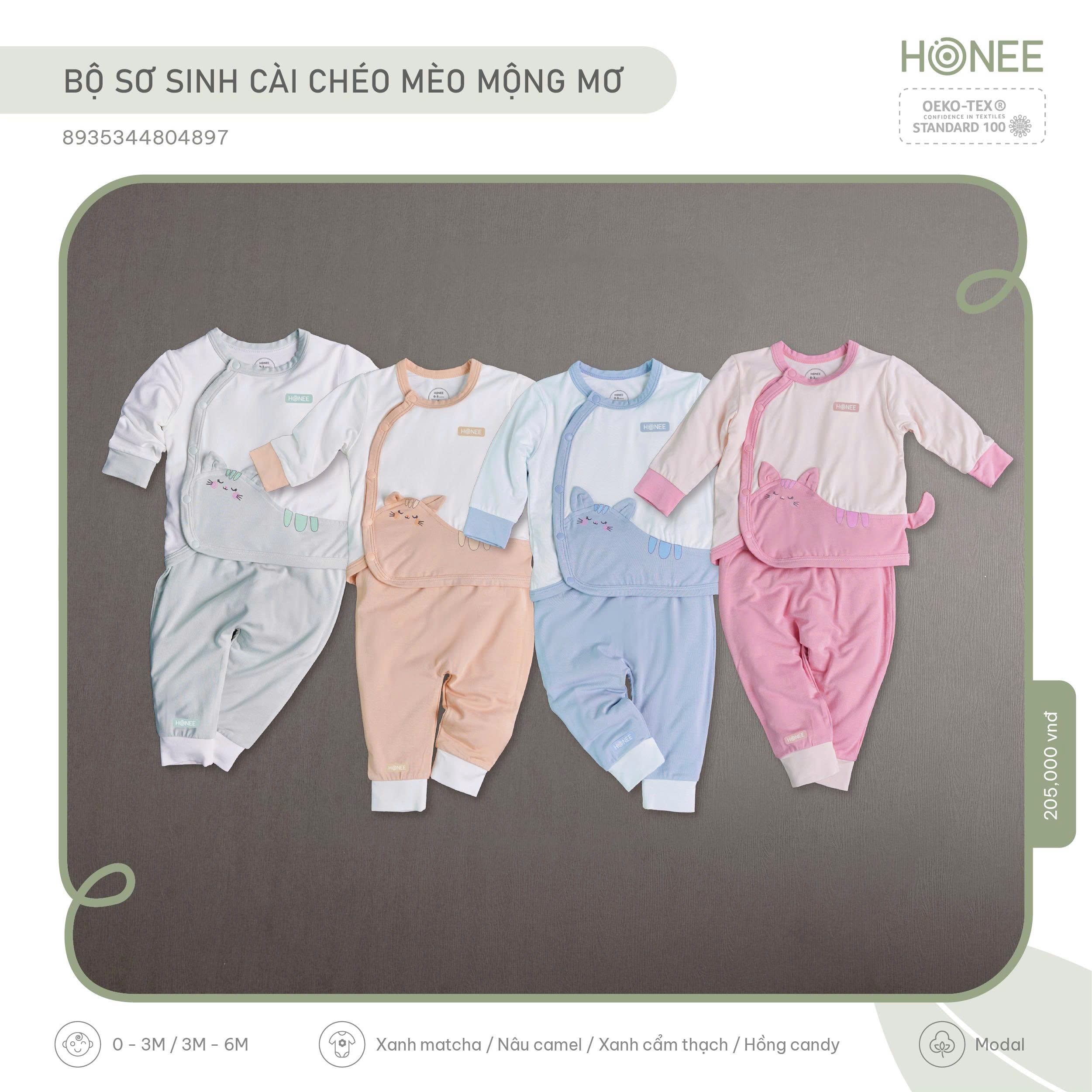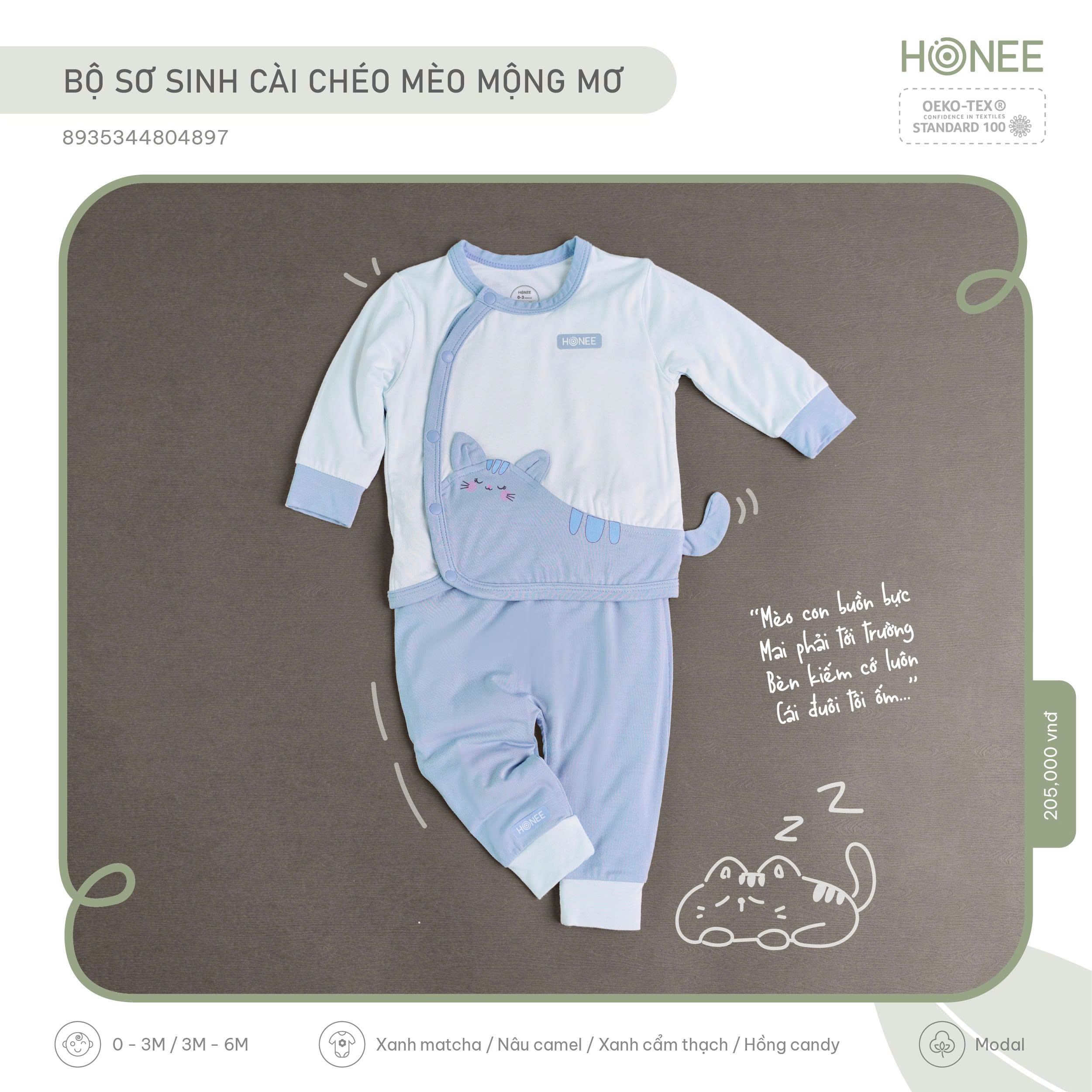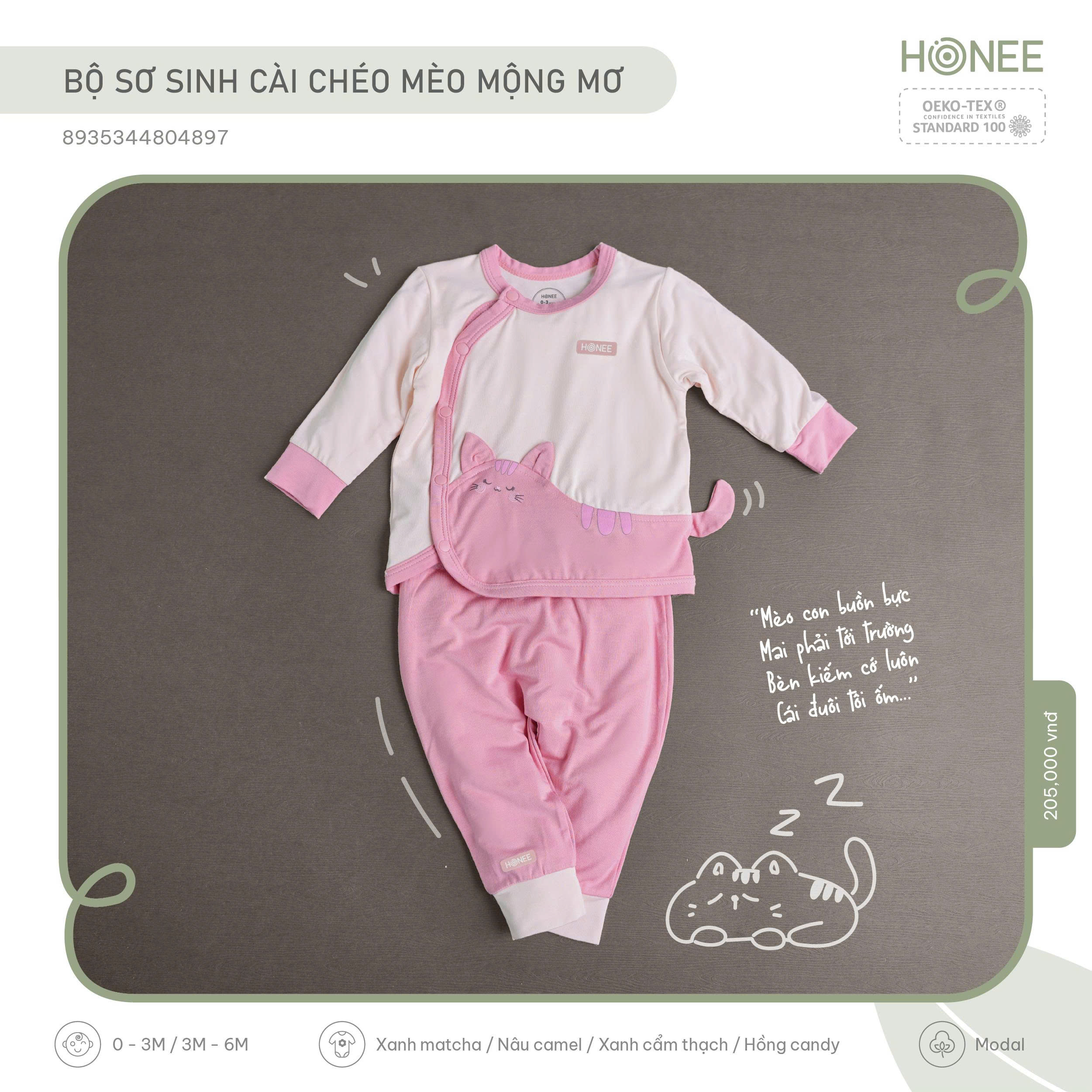 Lấy cảm hứng từ giấc mơ ngọt ngào đầu đời, Honee thiết kế bộ sơ sinh hình mèo với chiếc đuôi cong ôm lấy bụng bé – như một cái ôm nhỏ của mẹ, nhẹ nhàng và an tâm.