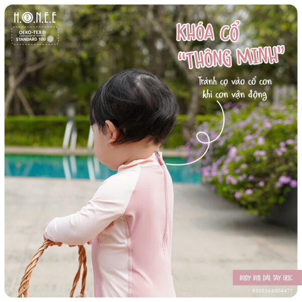 Body dài tay giúp hạn chế tiếp xúc với ánh nắng, cát biển và gió, cực kỳ phù hợp với làn da nhạy cảm của bé. Thiết kế cổ tròn, khóa kéo tiện lợi giúp mẹ dễ dàng thay đồ cho bé mà không gây khó chịu.
