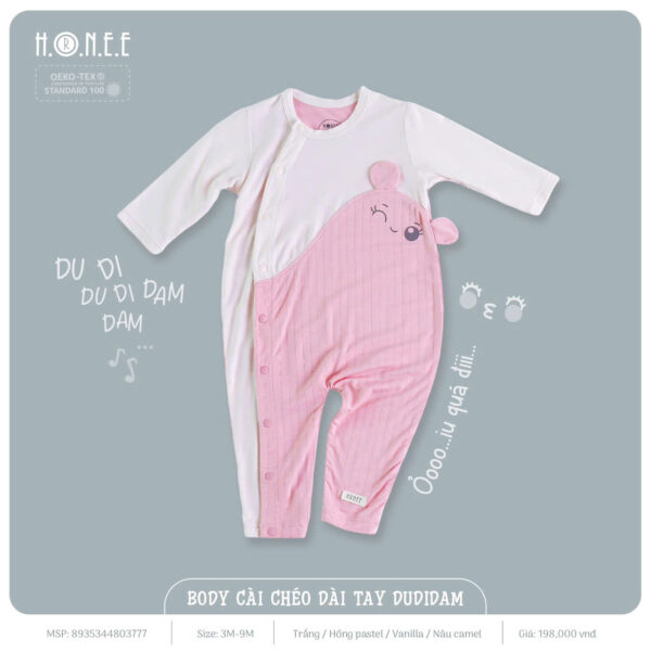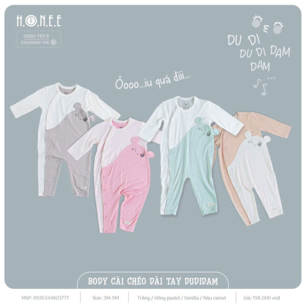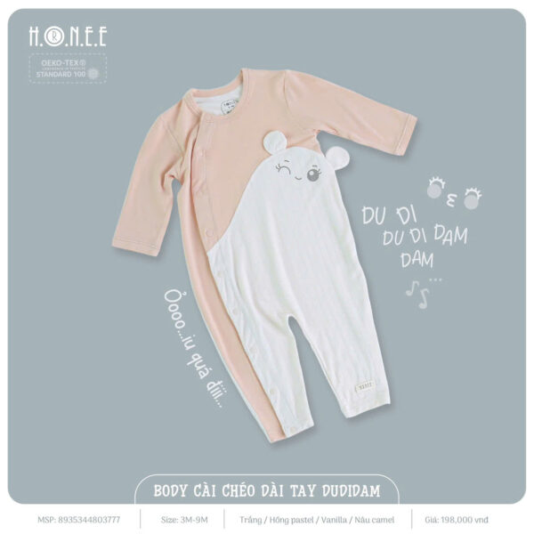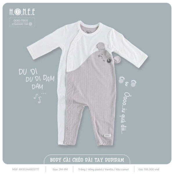 Body cài chéo dài tay Dudidam không chỉ thu hút nhờ chất liệu vải bamboo siêu thấm, mà còn nổi bật với thiết kế hình in Dudidam độc đáo, mang đậm dấu ấn sáng tạo của HRNEE.