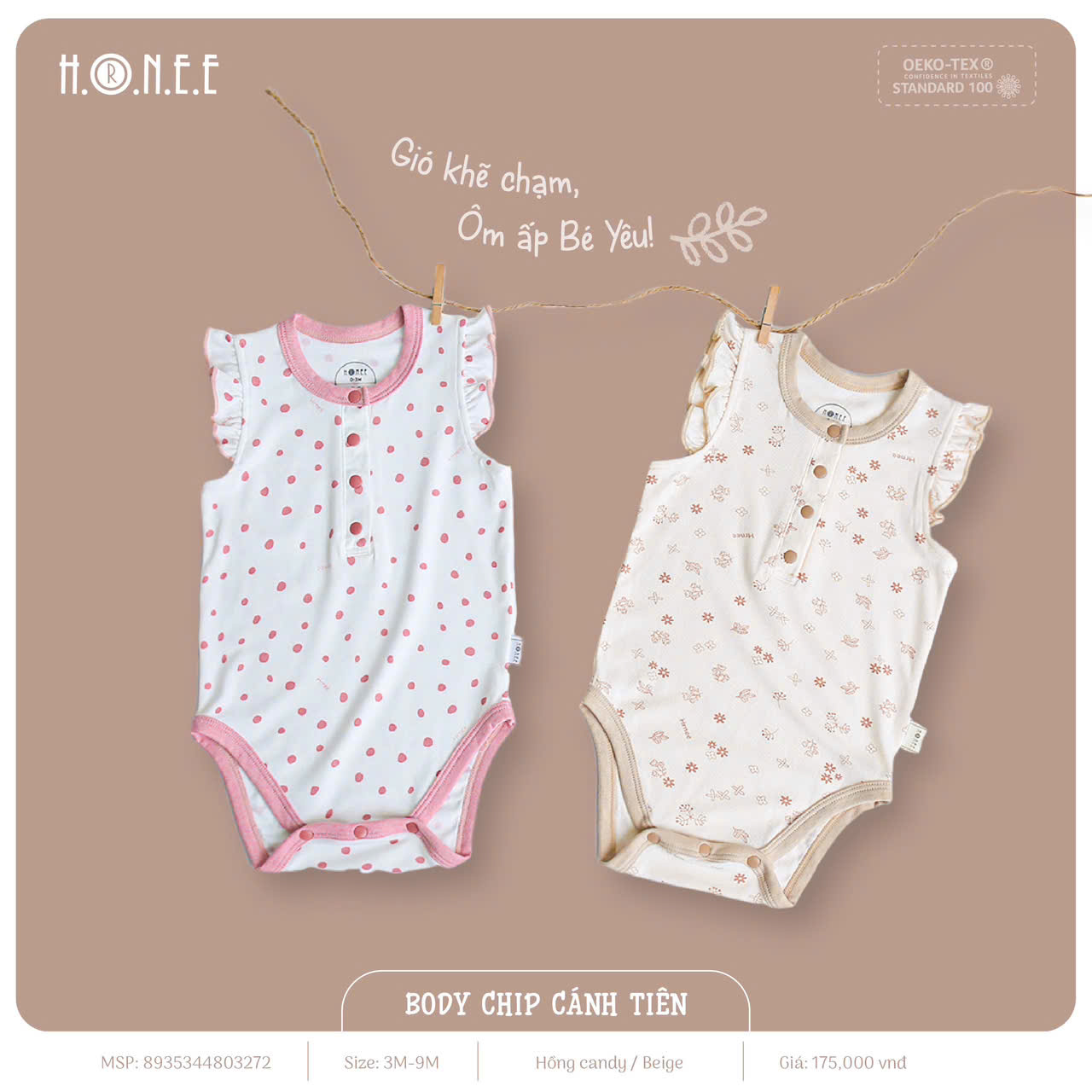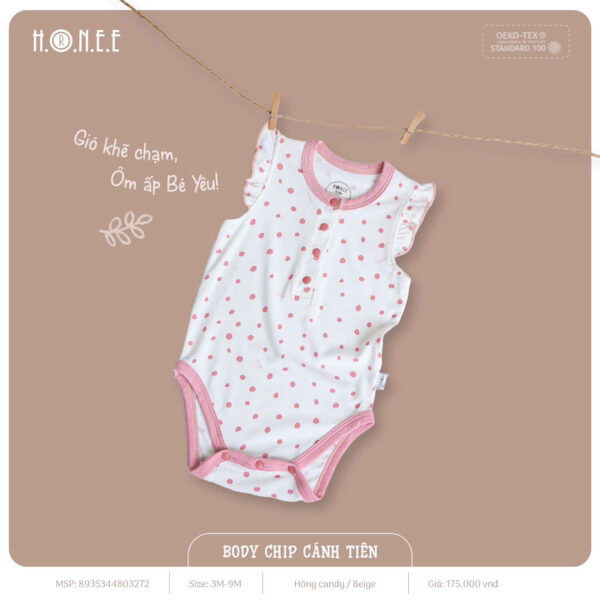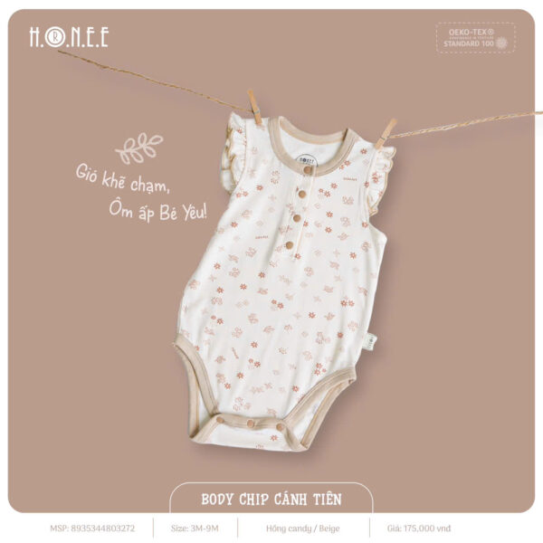 Thiết kế body với đôi cánh tiên dễ thương, kết hợp cùng hình in hoa nhí xinh xắn, tạo điểm nhấn nhẹ nhàng và đáng yêu cho bé gái. Đây là sự lựa chọn hoàn hảo giúp bé vừa thoải mái, vừa dễ thương trong những ngày đầu đời.