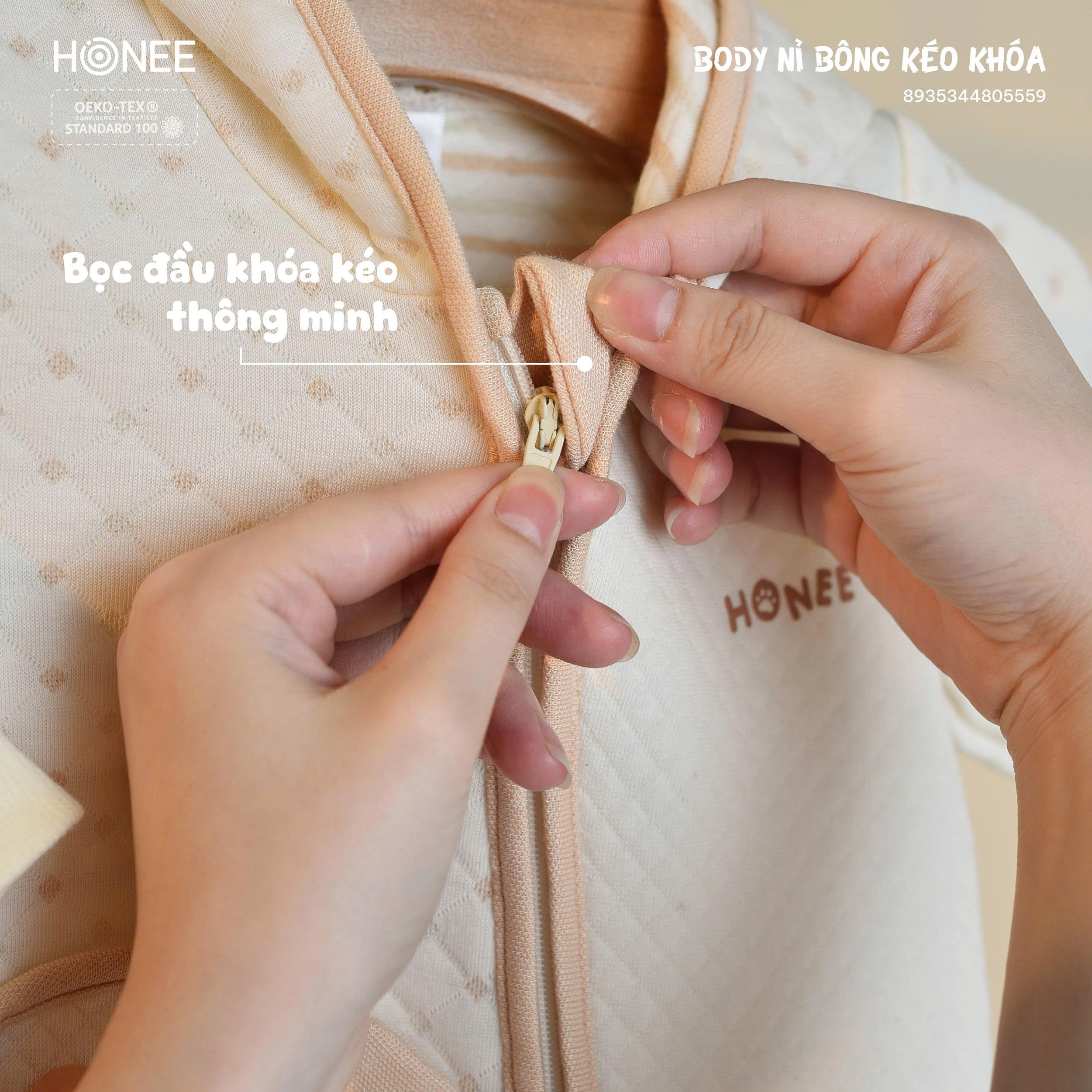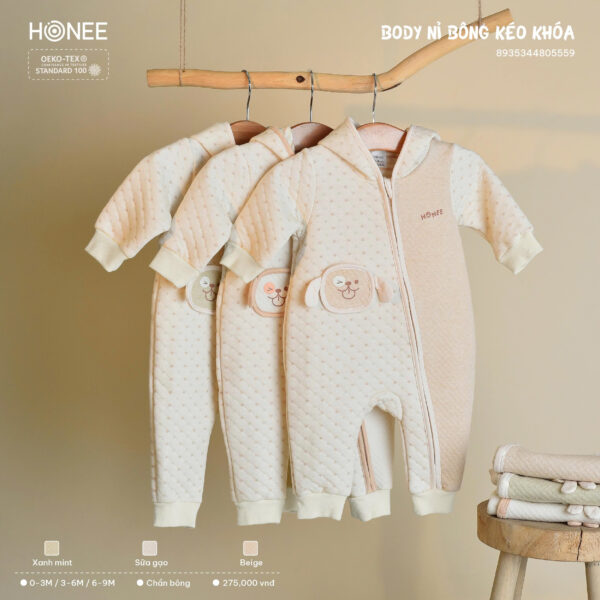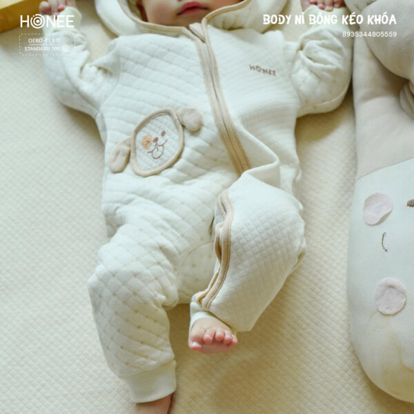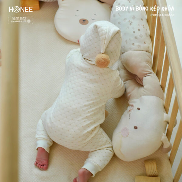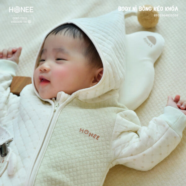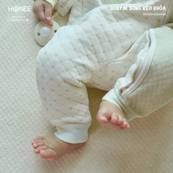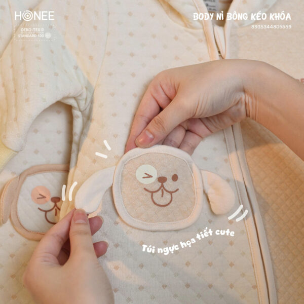 Phần khóa kéo chéo giúp mẹ thay đồ nhanh chóng. Đầu bọc khóa che kín, không gây cấn hay cọ vào da bé.