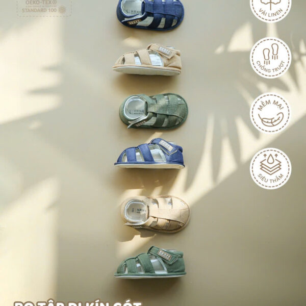 Chất liệu vải cao cấp mềm mại, thân thiện với làn da nhạy cảm của bé, không gây kích ứng hay khó chịu. Đặc biệt, lớp lót bên trong siêu thấm hút mồ hôi giúp chân bé luôn khô thoáng suốt cả ngày, giữ cho bé cảm thấy dễ chịu và không bị bí bách dù phải di chuyển nhiều. Đế giày được thiết kế chống trơn trượt, mang đến sự an toàn tuyệt đối khi bé vui chơi hoặc bước đi.