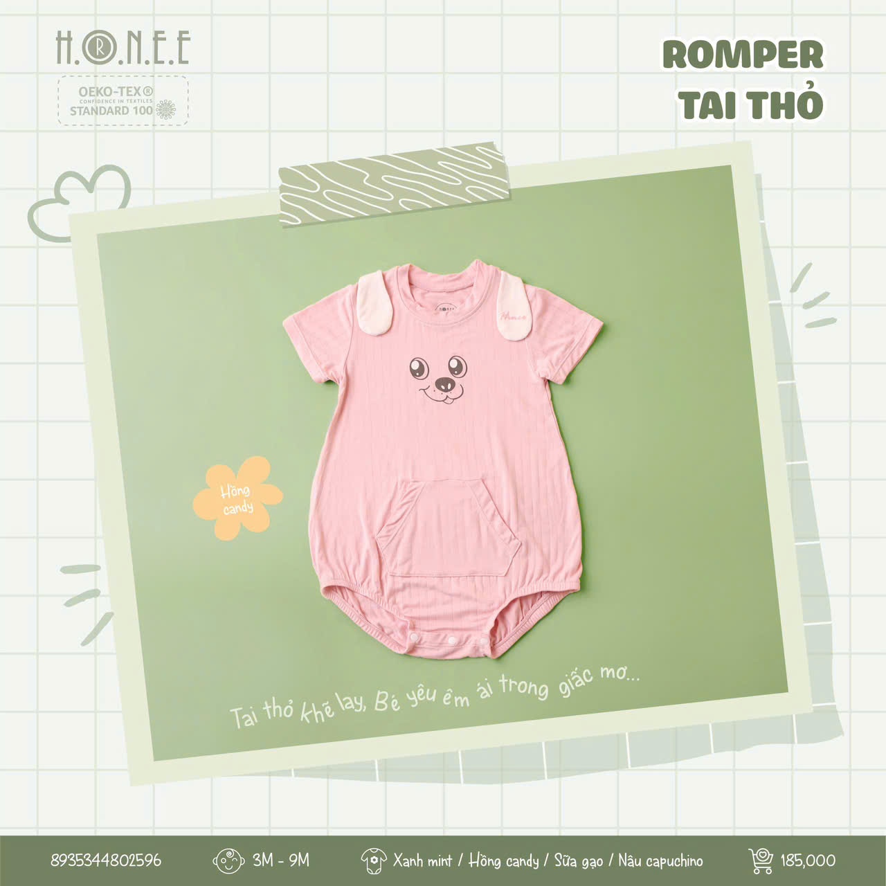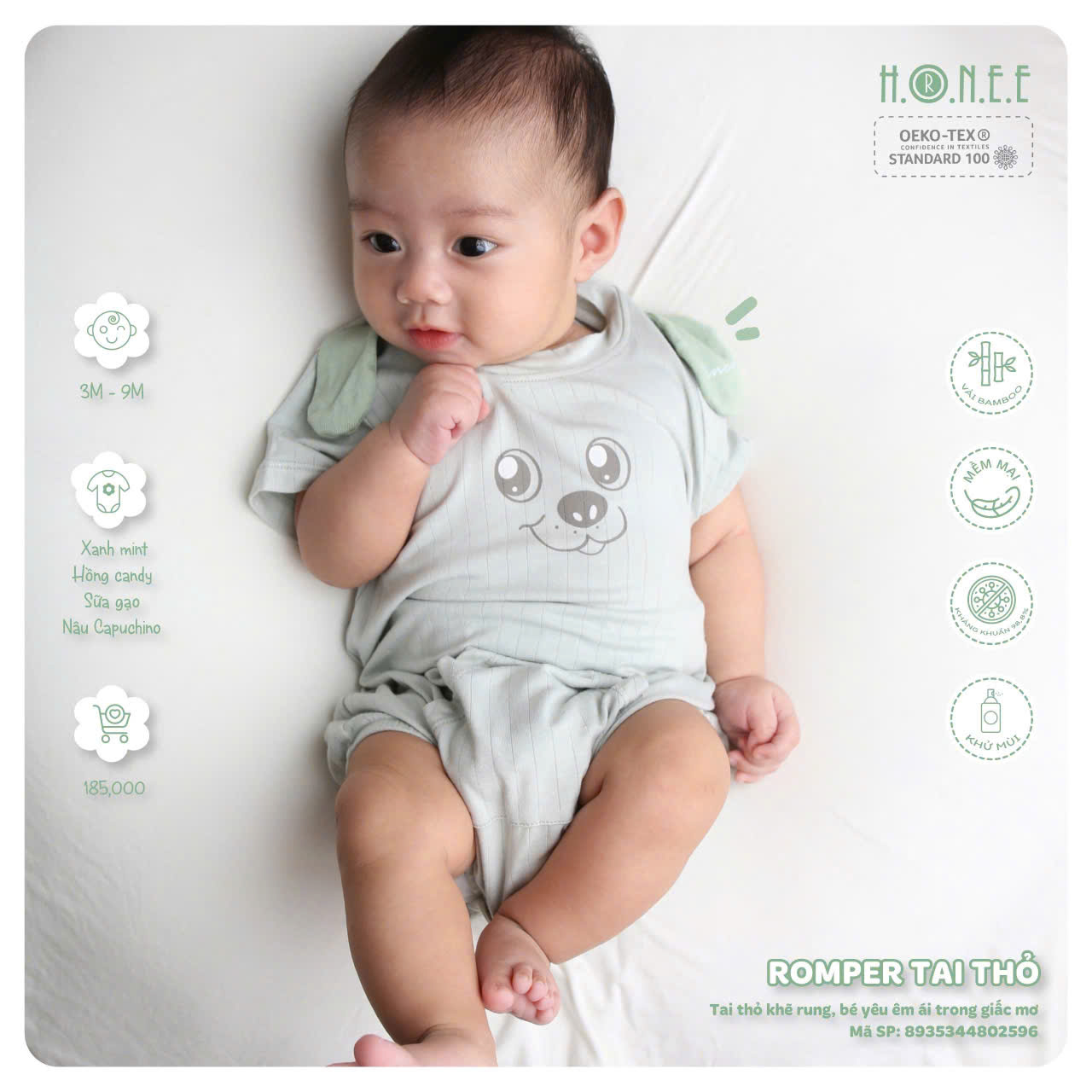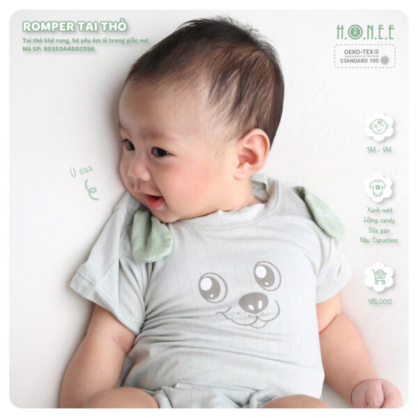 Romper tai thỏ 3D dễ thương, vải Bamboo kháng khuẩn 98,8%, khử mùi, mềm mại, an toàn đạt chuẩn OEKO-TEX®, bé xinh xắn suốt hè!