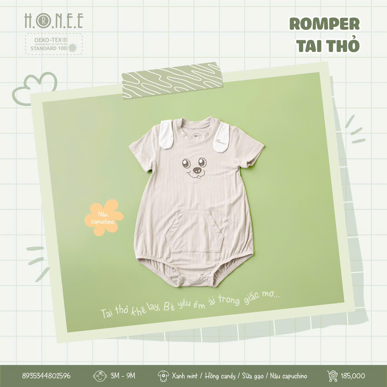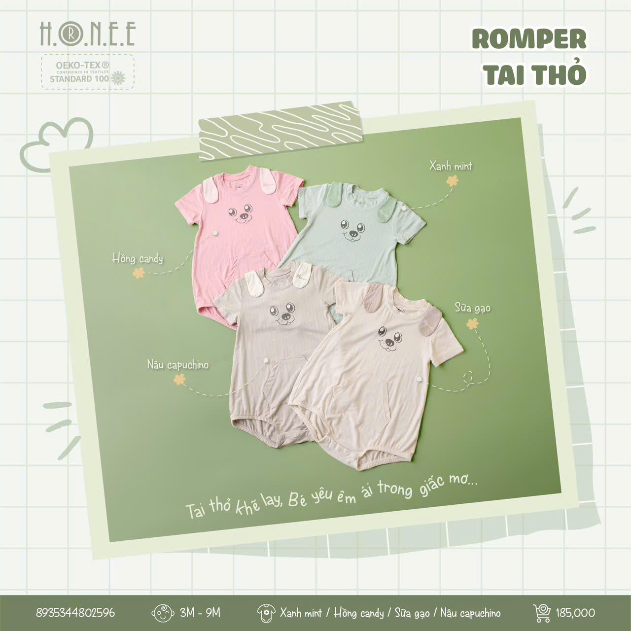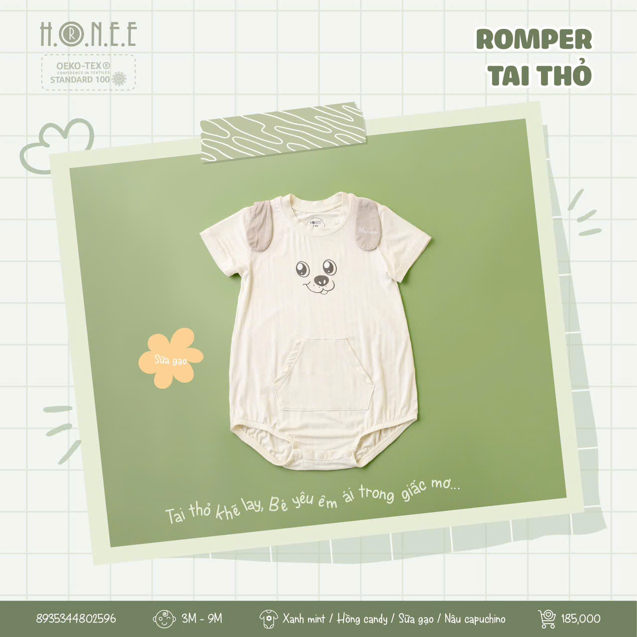 Romper tai thỏ 3D dễ thương, vải Bamboo kháng khuẩn 98,8%, khử mùi, mềm mại, an toàn đạt chuẩn OEKO-TEX®, bé xinh xắn suốt hè!