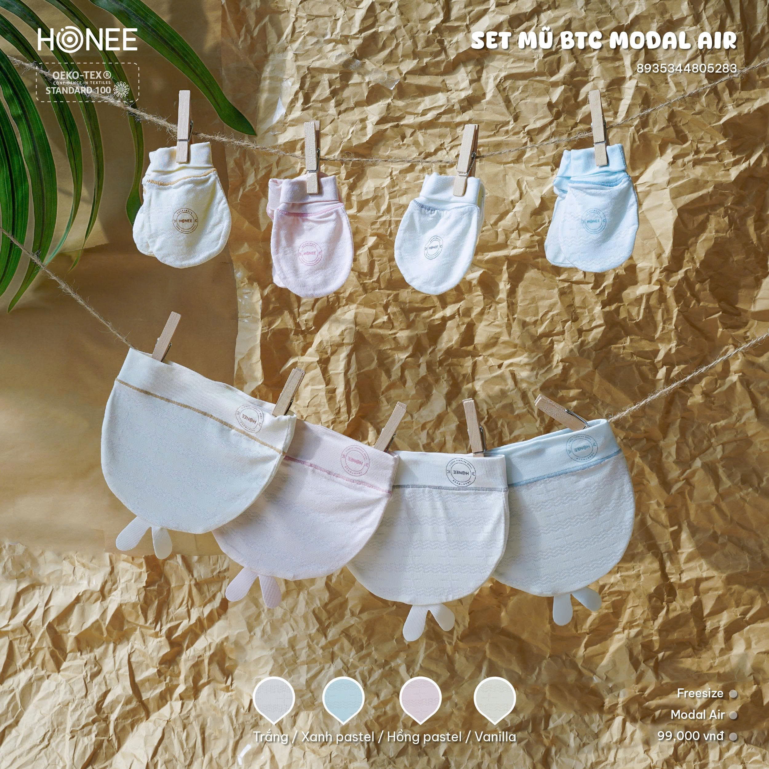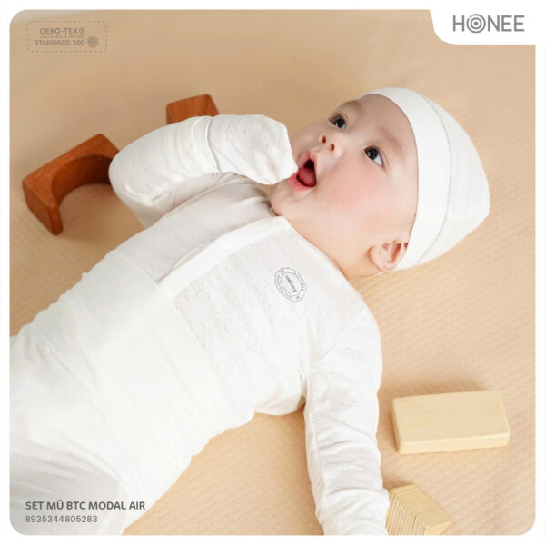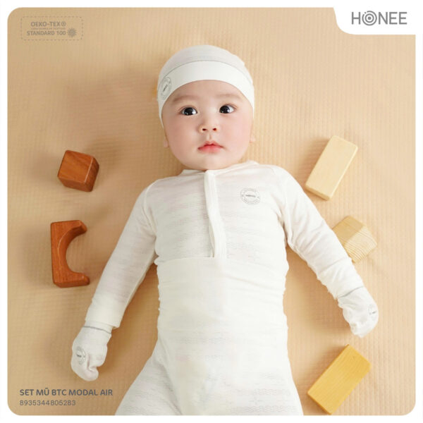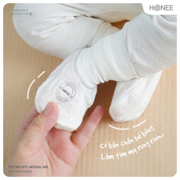 Mũ freesize ôm trọn phần đầu bé, không trượt hay gây khó chịu. Bao tay, bao chân bo nhẹ, ôm gọn cổ tay cổ chân, không để lại vết hằn.