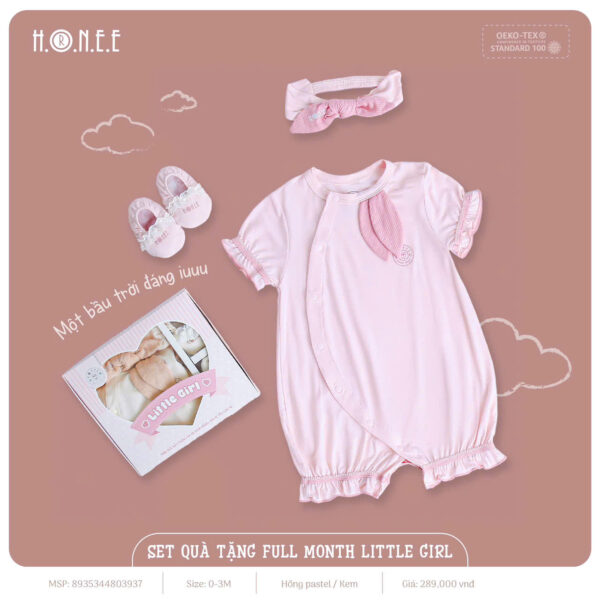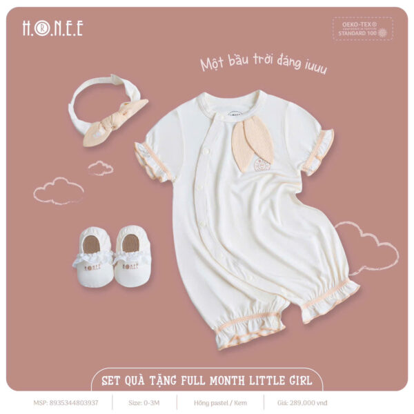 Set quà tặng Full Month cho bé gái gồm 1 body xinh xắn, 1 turban dễ thương và 1 đôi bao chân đáng yêu, tất cả được đựng trong hộp sang trọng, là món quà đầy ý nghĩa cho bé yêu trong ngày đầy tháng. Chất liệu mềm mại, an toàn cho làn da nhạy cảm của bé, giúp bé thoải mái và dễ chịu.