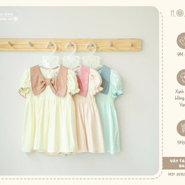 Váy được thiết kế với dáng babydoll dễ thương, phù hợp với mọi dáng người, giúp bé trông xinh xắn như một nàng công chúa nhỏ. Điểm nhấn đặc biệt là chiếc nơ bản to ở cổ, tạo cảm giác vừa sang trọng, vừa đáng yêu.