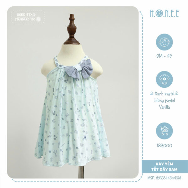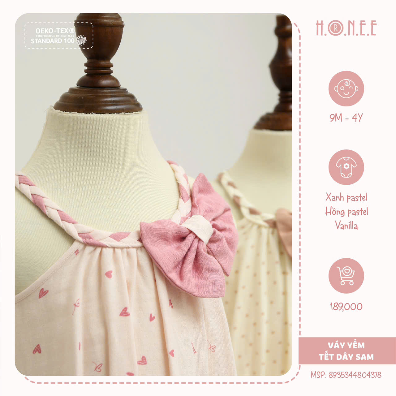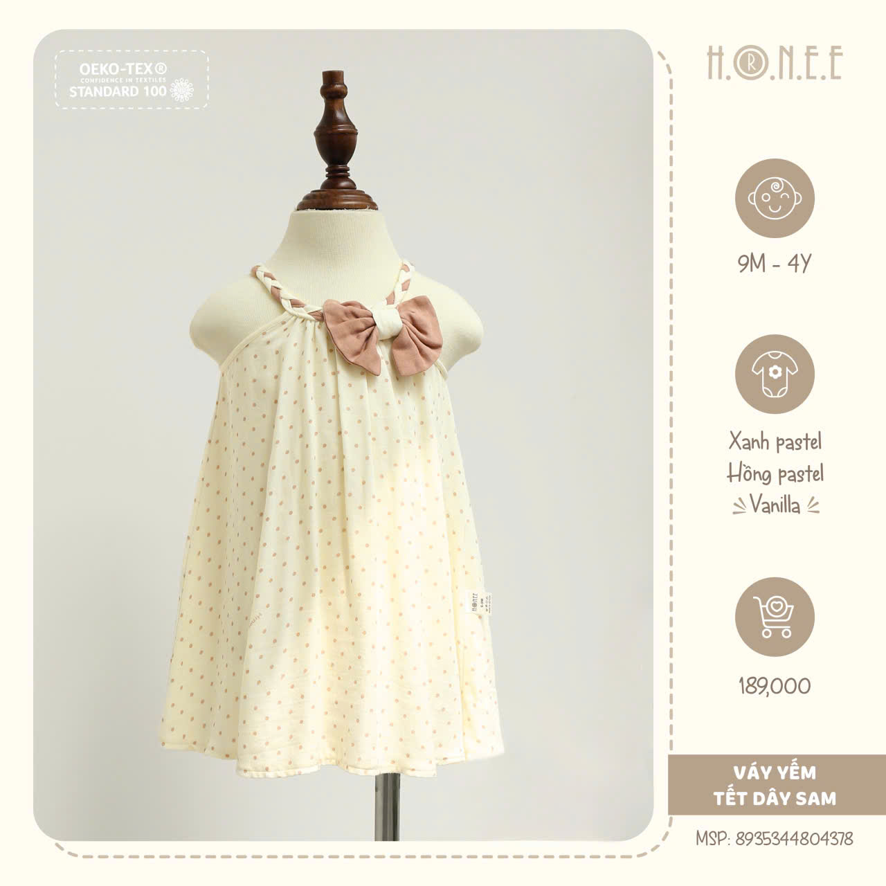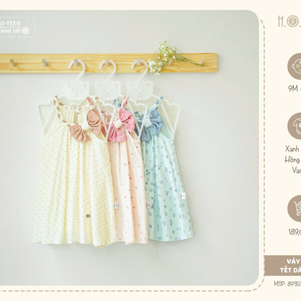 Điểm nhấn đặc biệt của chiếc váy chính là chiếc nơ bản to xinh xắn, tạo nét ngọt ngào, đáng yêu, giúp bé trông như một nàng công chúa nhỏ. Bảng màu pastel dịu nhẹ càng làm tôn lên vẻ trong trẻo, tinh khôi của bé, phù hợp với nhiều dịp khác nhau từ đi chơi, dạo phố đến dự tiệc.