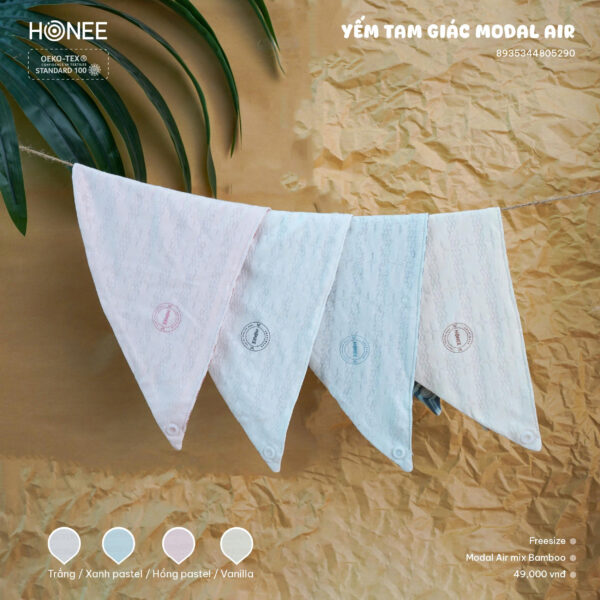 Form tam giác vừa vặn ôm sát cổ bé mà không bí bách. Hàng cúc bấm chắc chắn, dễ thao tác. Màu pastel nhẹ nhàng, xinh xắn, có thể phối với bất kỳ bộ đồ nào của bé.