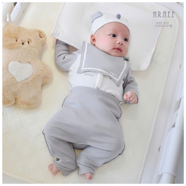 Thiết kế lấy cảm hứng từ trang phục thủy thủ đáng yêu, chiếc yếm tô điểm thêm sự ngộ nghĩnh cho outfit của bé, khiến bé trông như một thủy thủ nhí dễ thương.