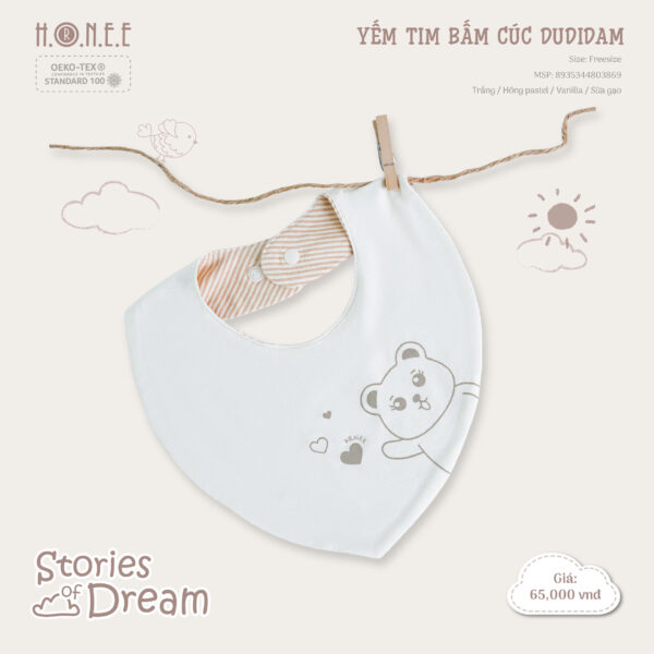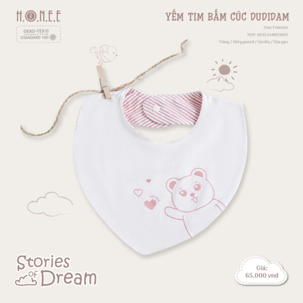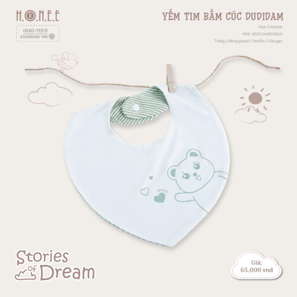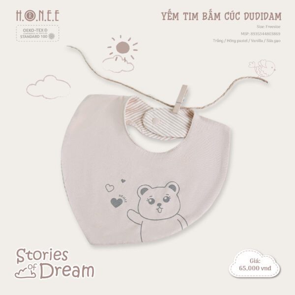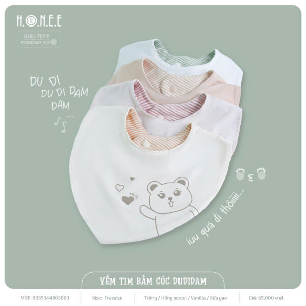 Thiết kế tim với 2 nấc bấm cúc tiện lợi giúp dễ dàng điều chỉnh và thay đổi kích cỡ, mang lại sự thoải mái tối đa cho bé, đồng thời giúp mẹ dễ dàng sử dụng. Hình in Dudidam, độc quyền từ HRNEE, không chỉ tạo điểm nhấn dễ thương mà còn làm bé thêm phần ngộ nghĩnh trong mọi khoảnh khắc. Chất liệu vải siêu thấm hút giúp yếm nhanh chóng thấm nước dãi và sữa, giữ cho bé luôn khô thoáng suốt cả ngày.